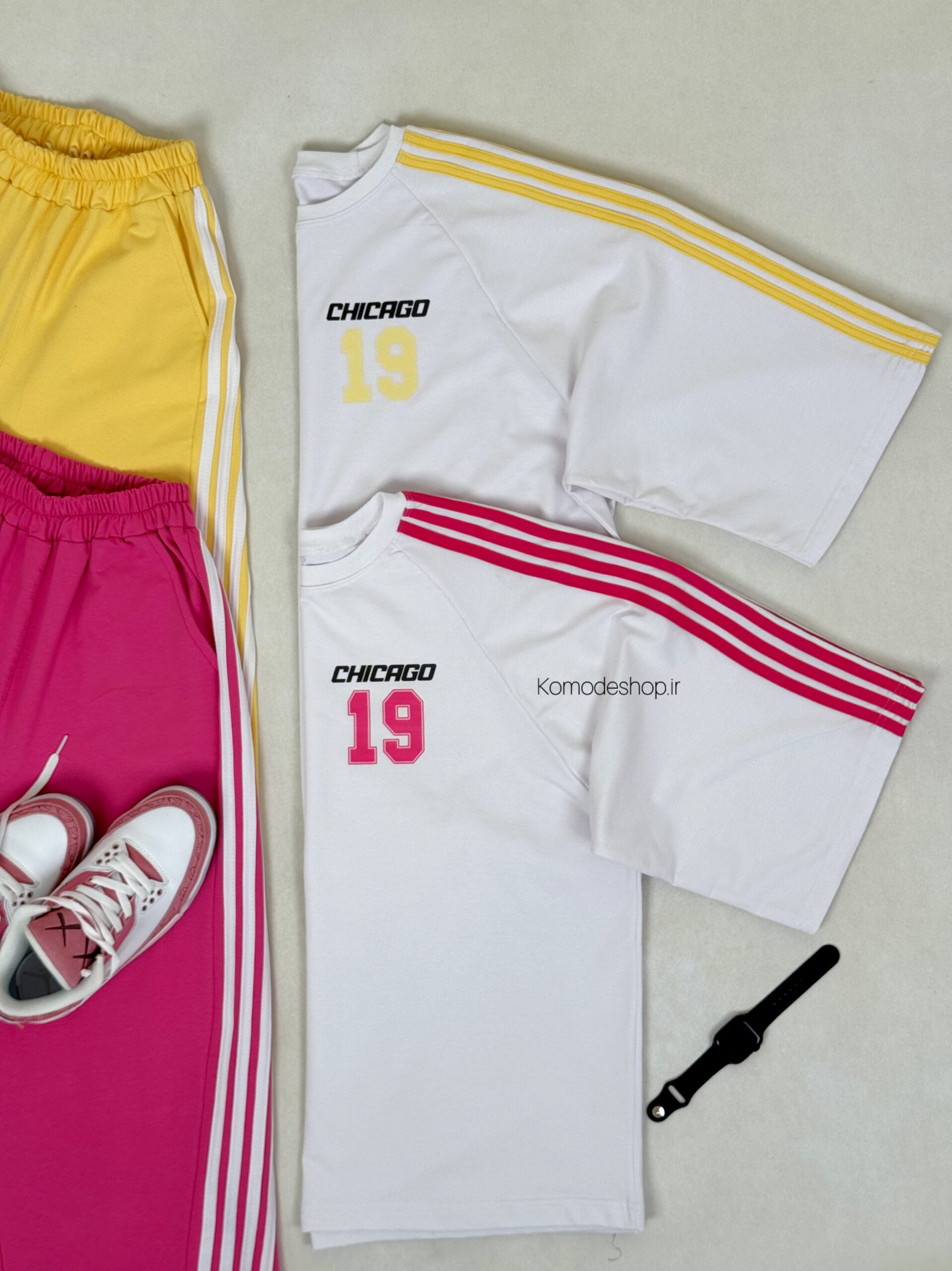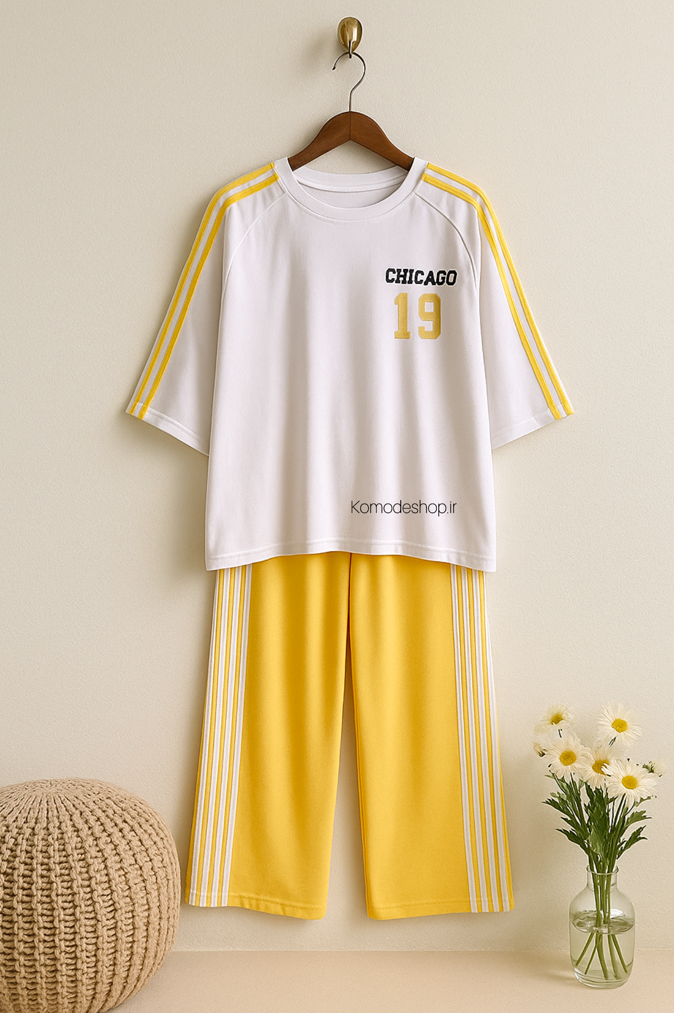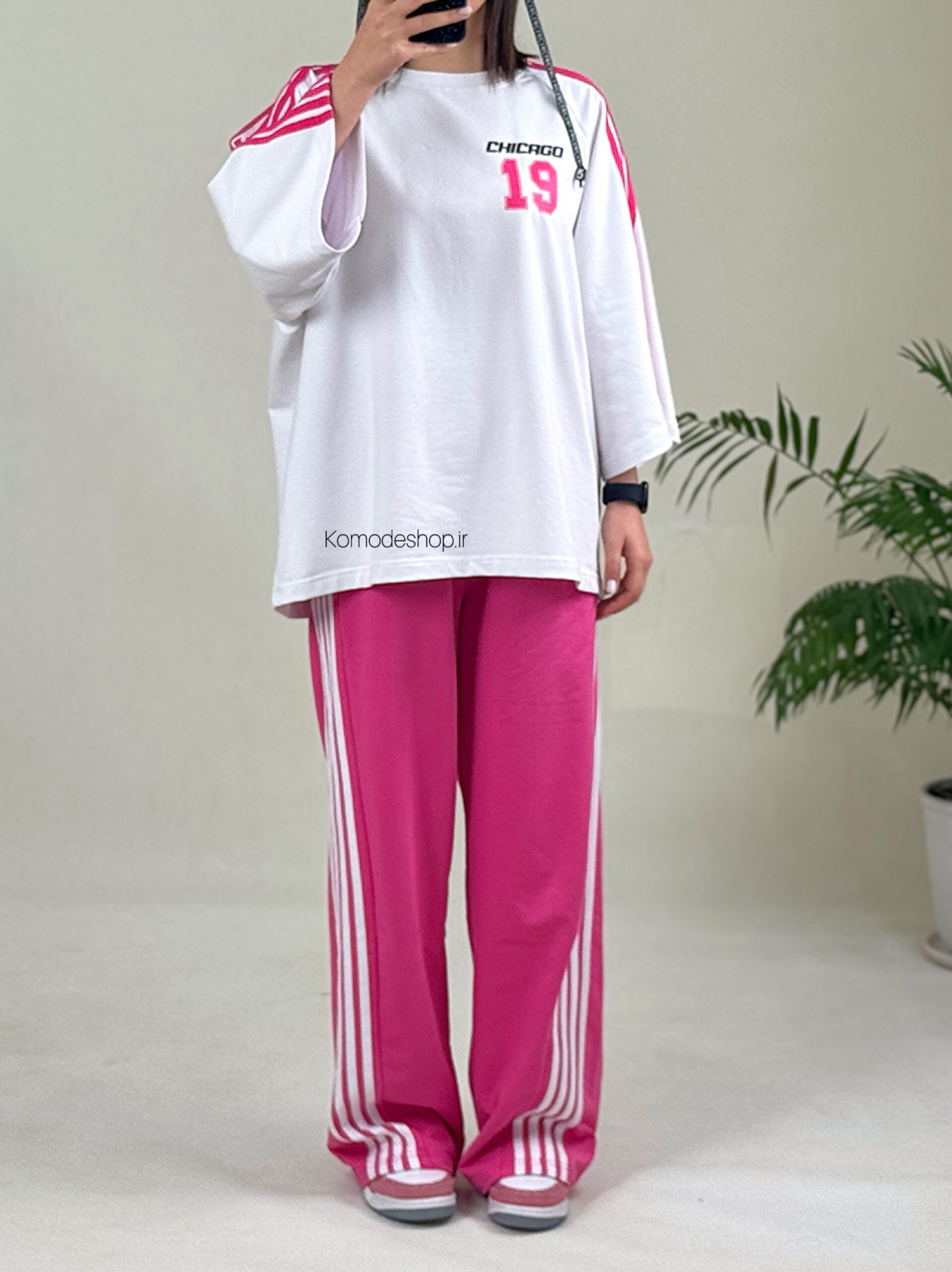 ست تیشرت و شلوار شیکاگو از پارچه گلکسی پنبهای دوخته شده؛ بدون هیچ پلیاستری و با کیفیت عالی و تضمینی. این ست اصلاً دوندون نمیشه و حسابی موندگاره مناسب سایزهای ۳۶ تا ۴۶ هست و برای استایلهای روزمره و تابستونی یه انتخاب فوقالعاده محسوب میشه.