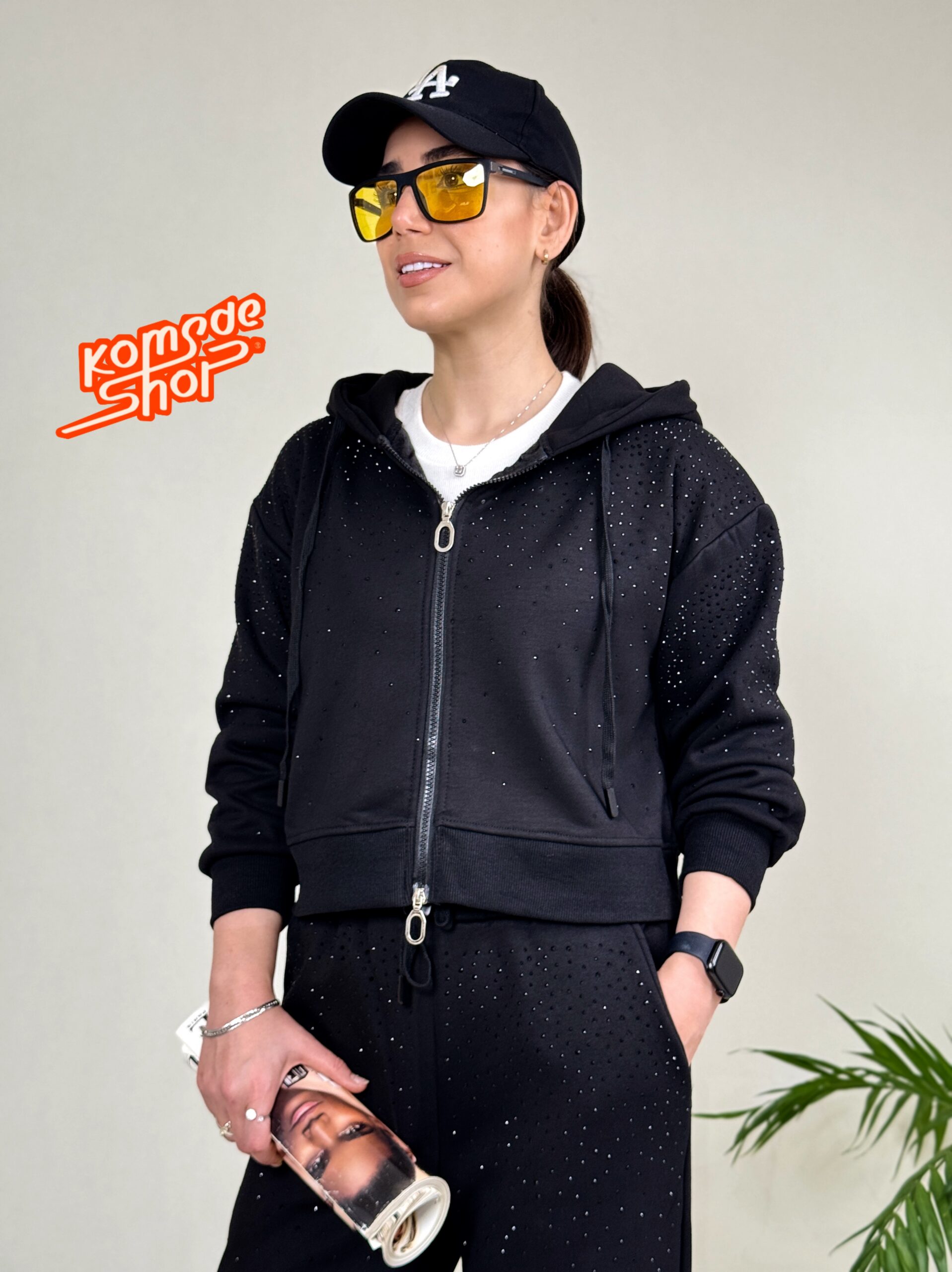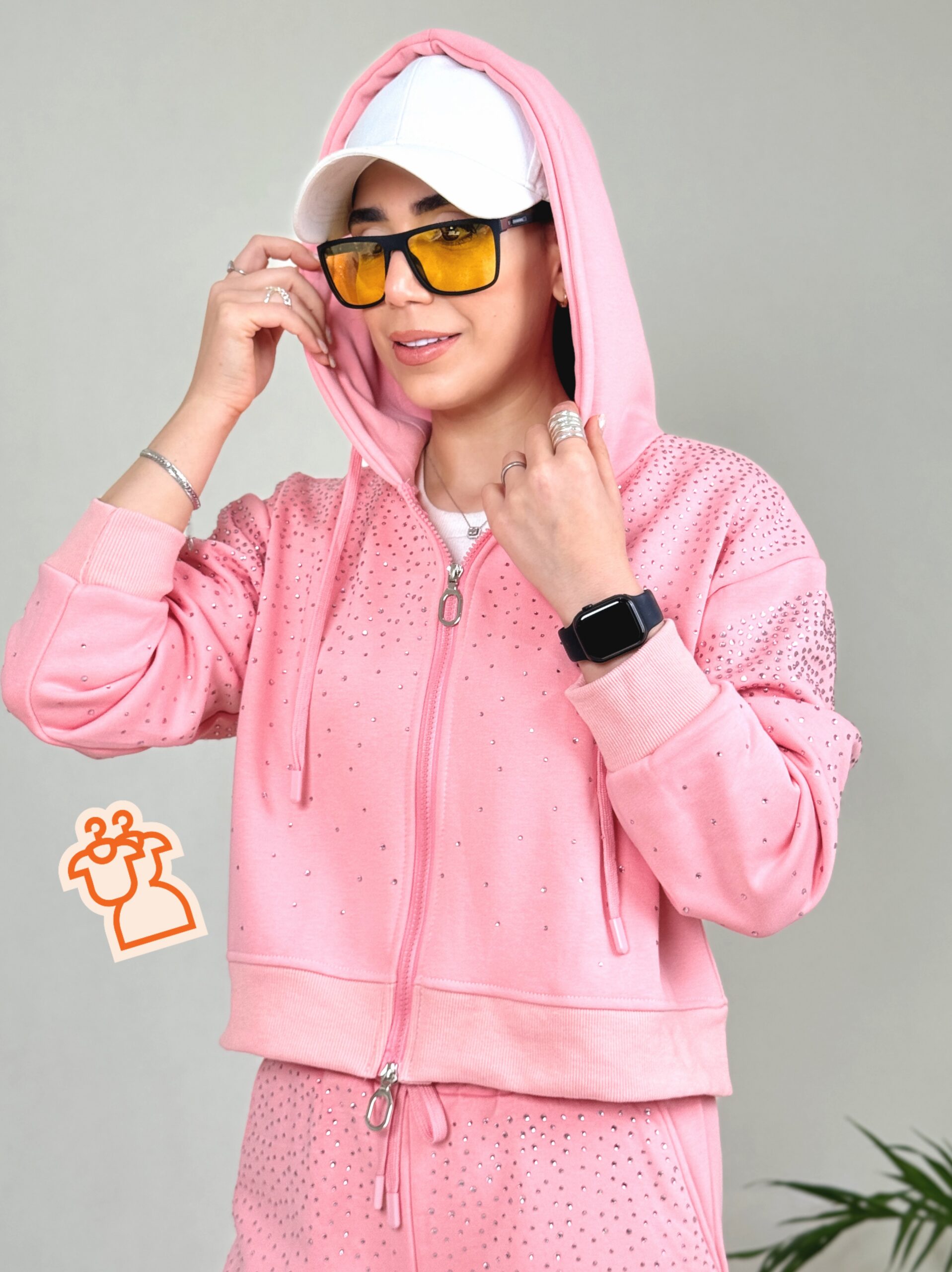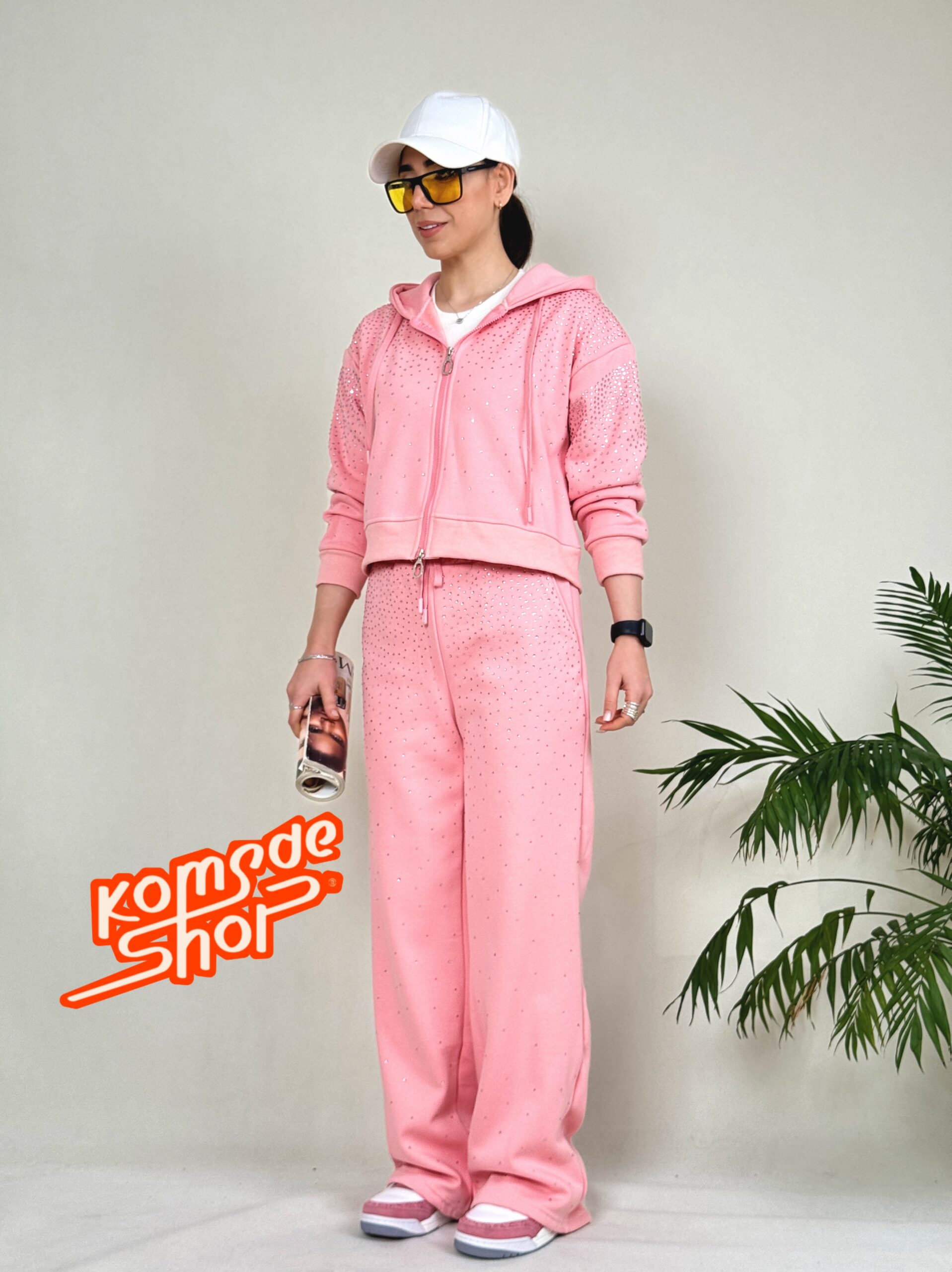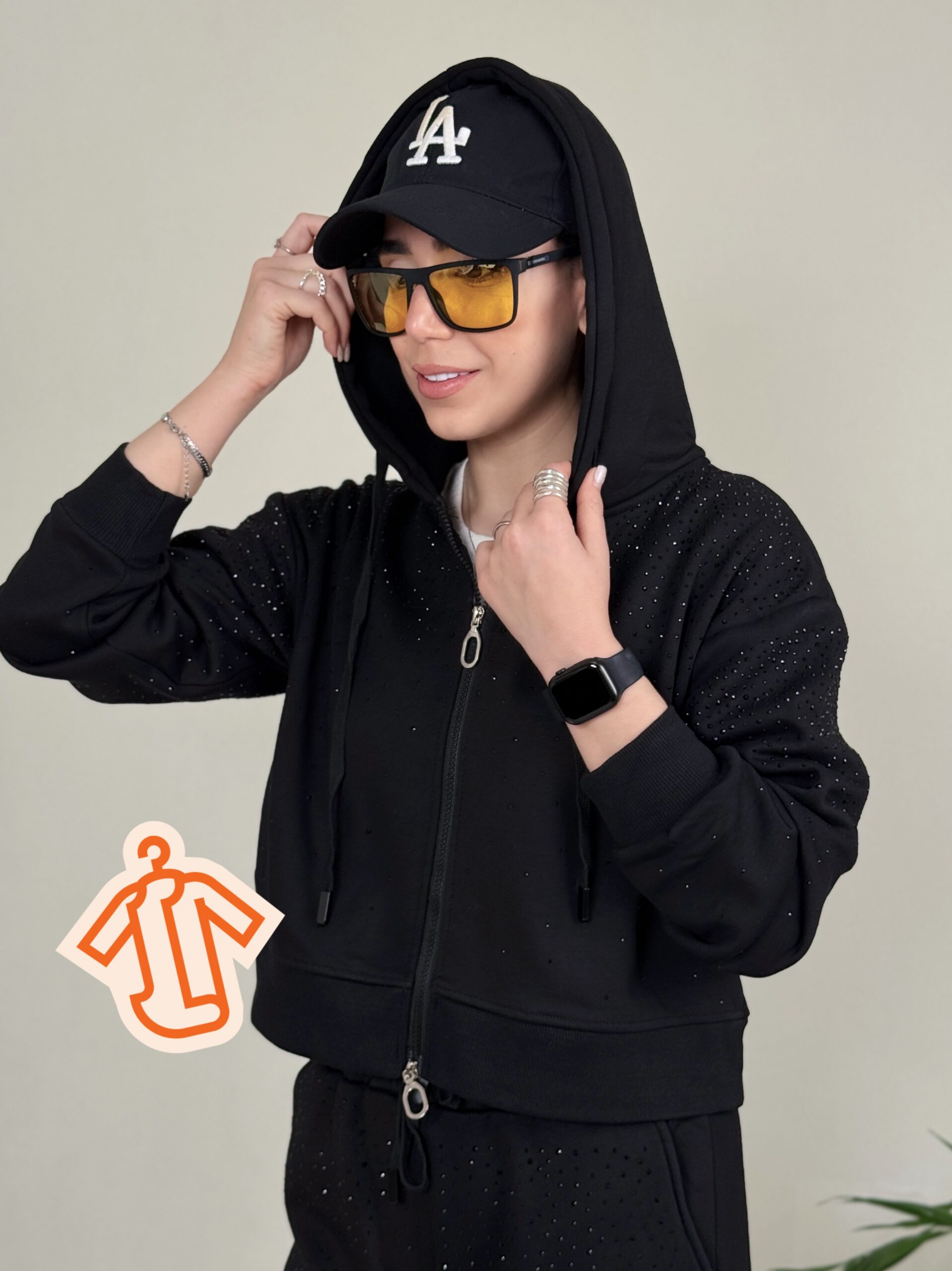 ست سویشرت و شلوار کلاه دار نگینی وارداتی با پارچه دورس سهنخ ۱۰۰٪ پنبه، داخل مخملی و نگینکاری ظریف. فریسایز، نرم، ضخیم و بسیار شیک برای استایل زمستونی لاکچری.
