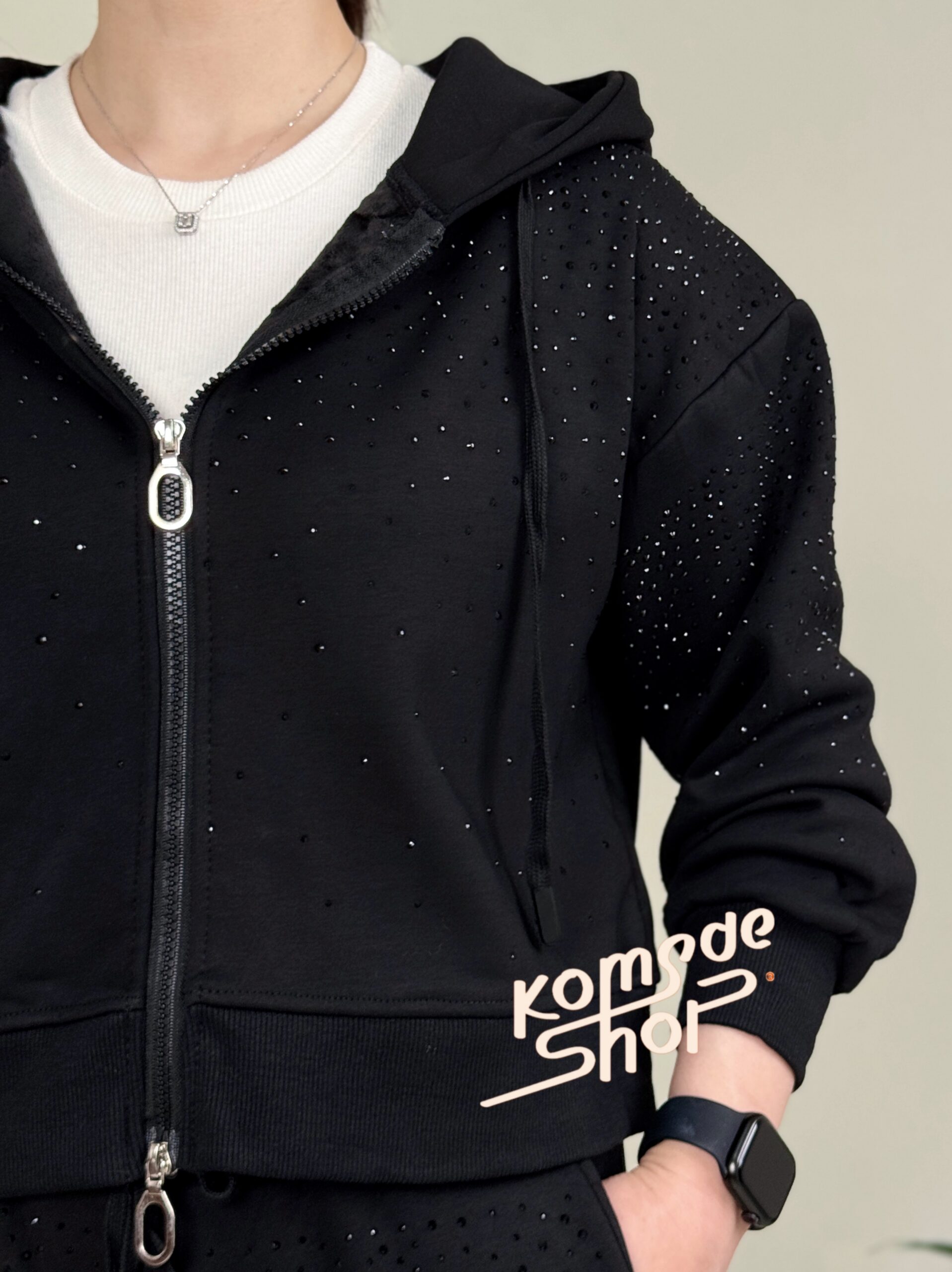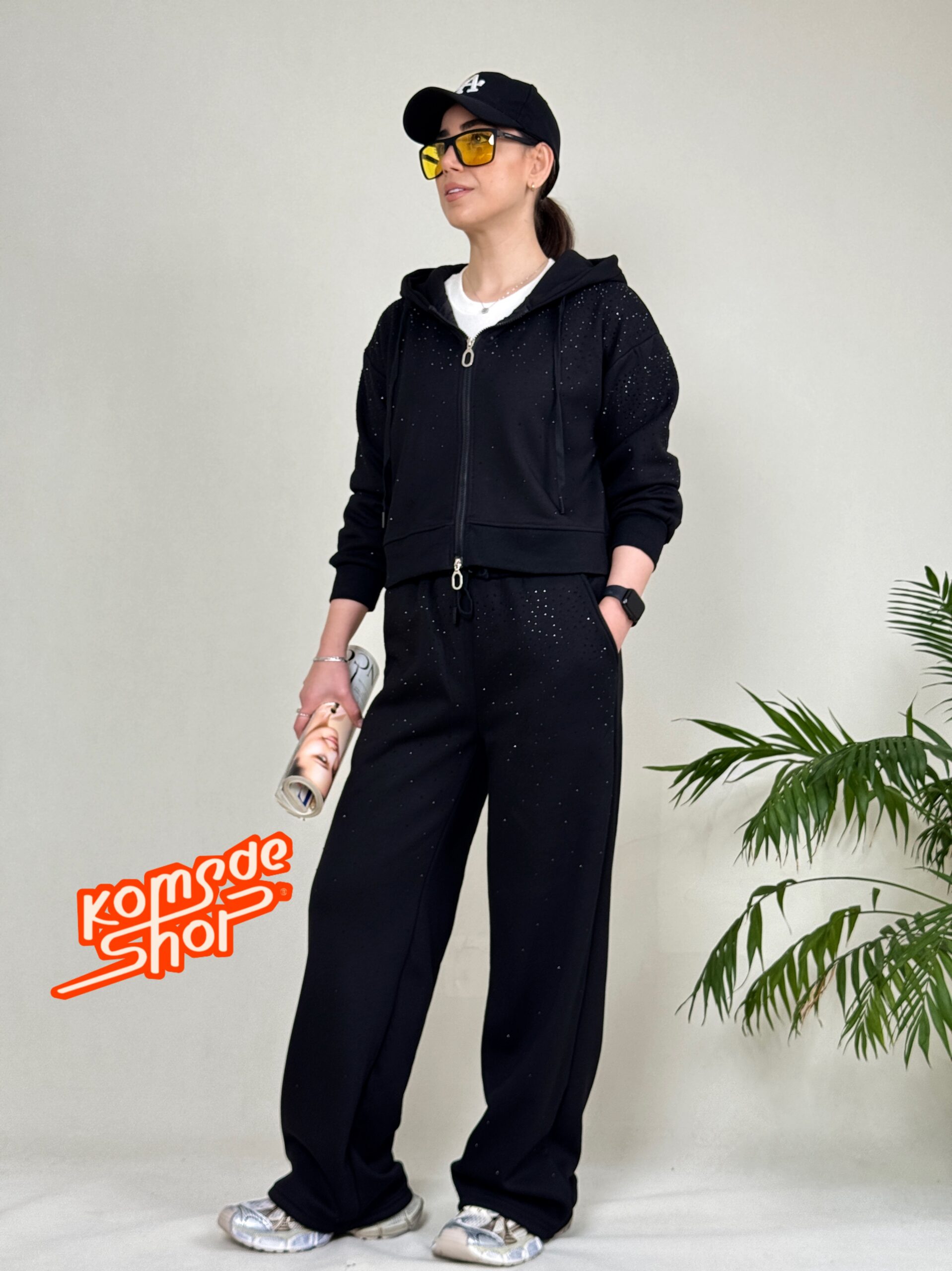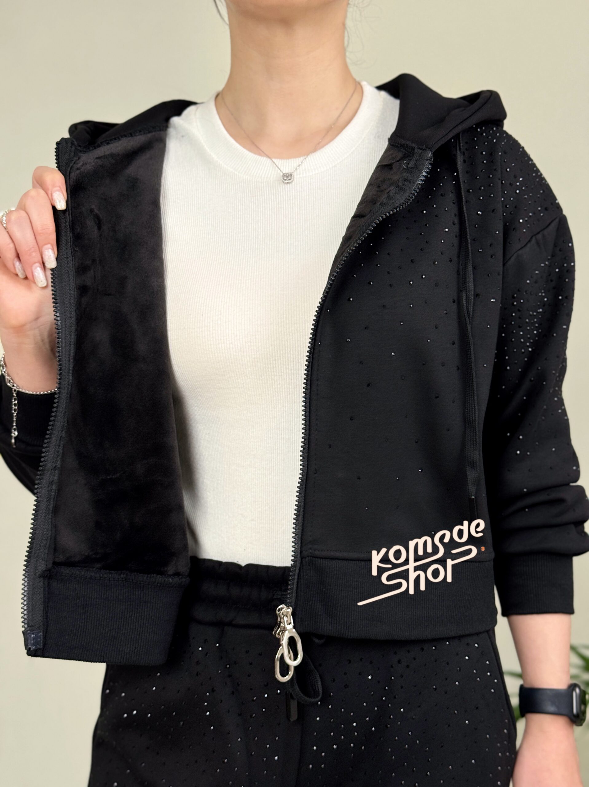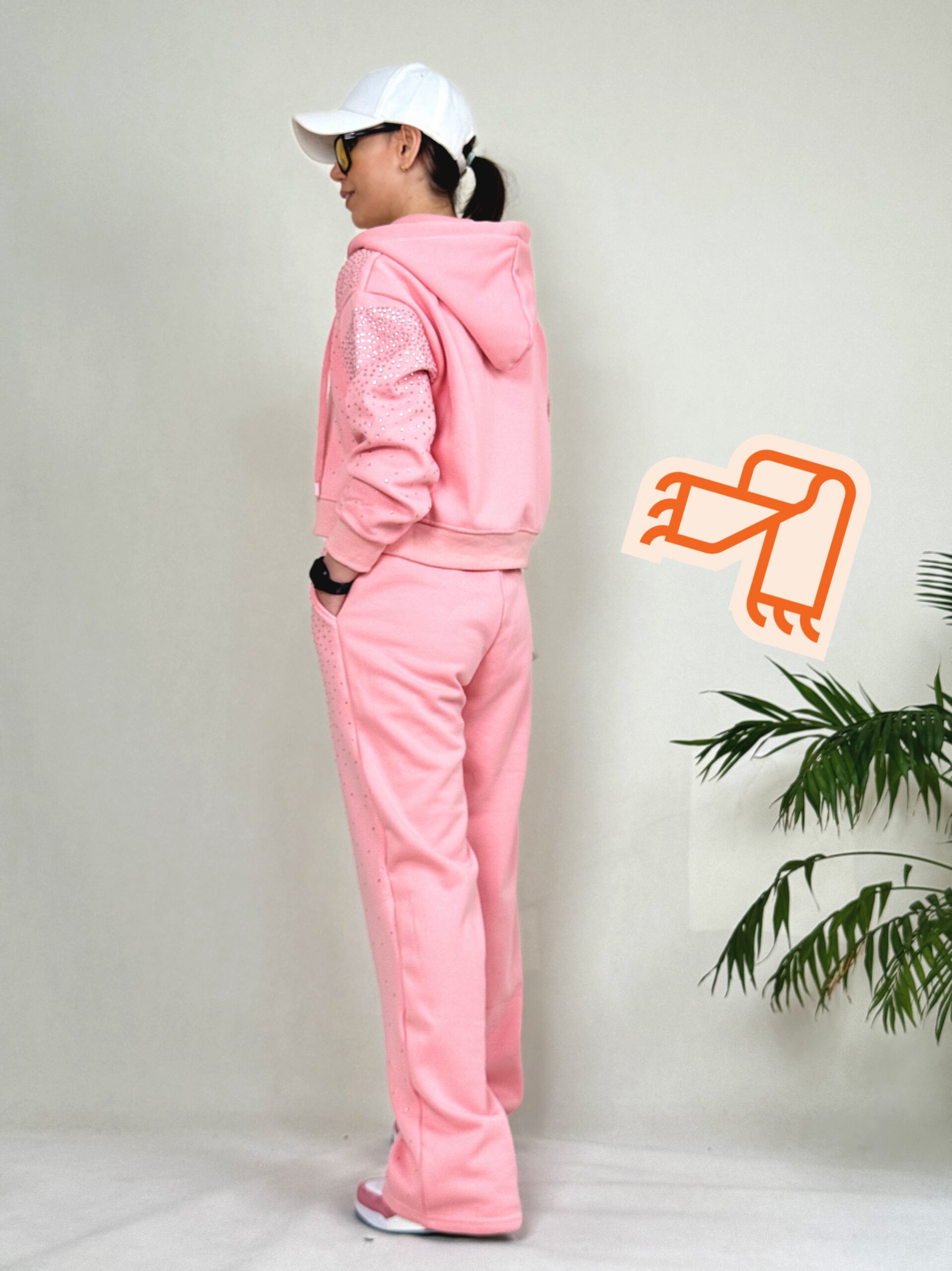 ست سویشرت و شلوار کلاه دار نگینی وارداتی با پارچه دورس سهنخ ۱۰۰٪ پنبه، داخل مخملی و نگینکاری ظریف. فریسایز، نرم، ضخیم و بسیار شیک برای استایل زمستونی لاکچری.