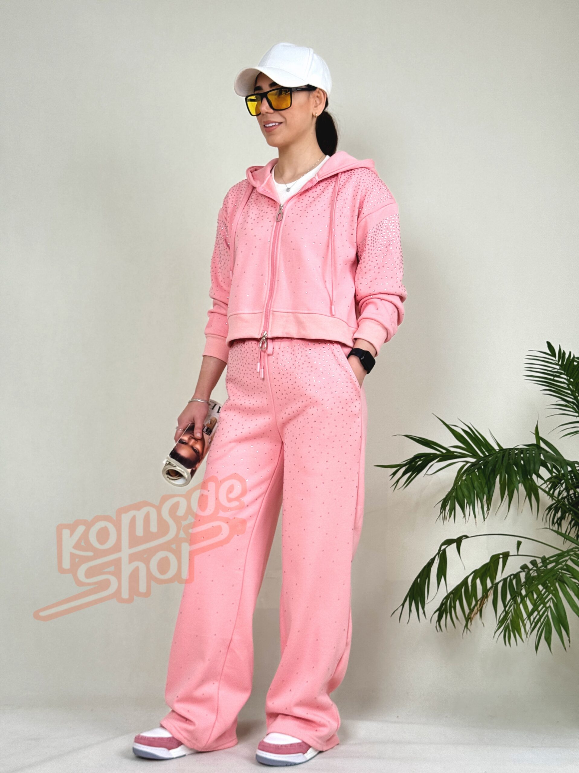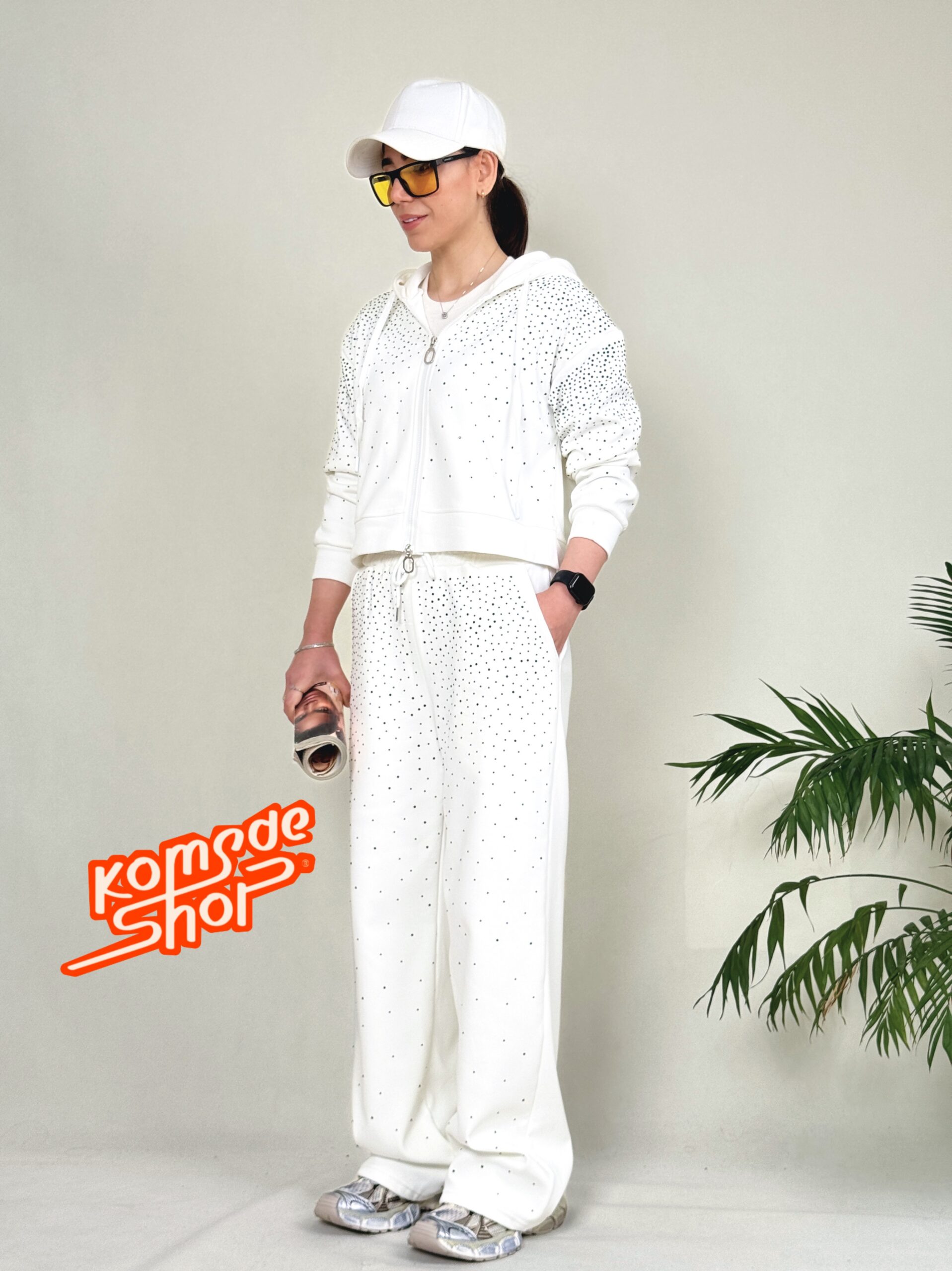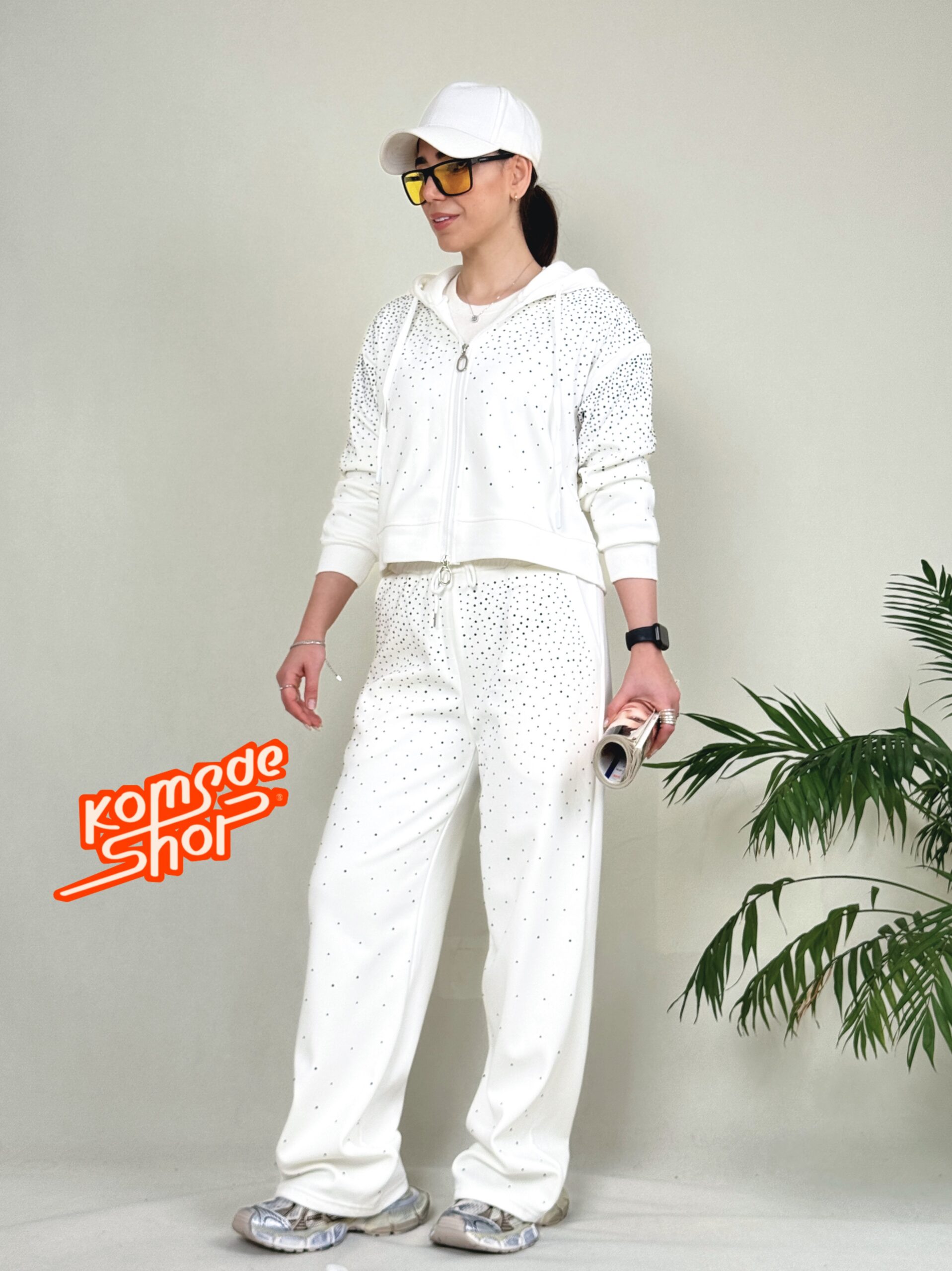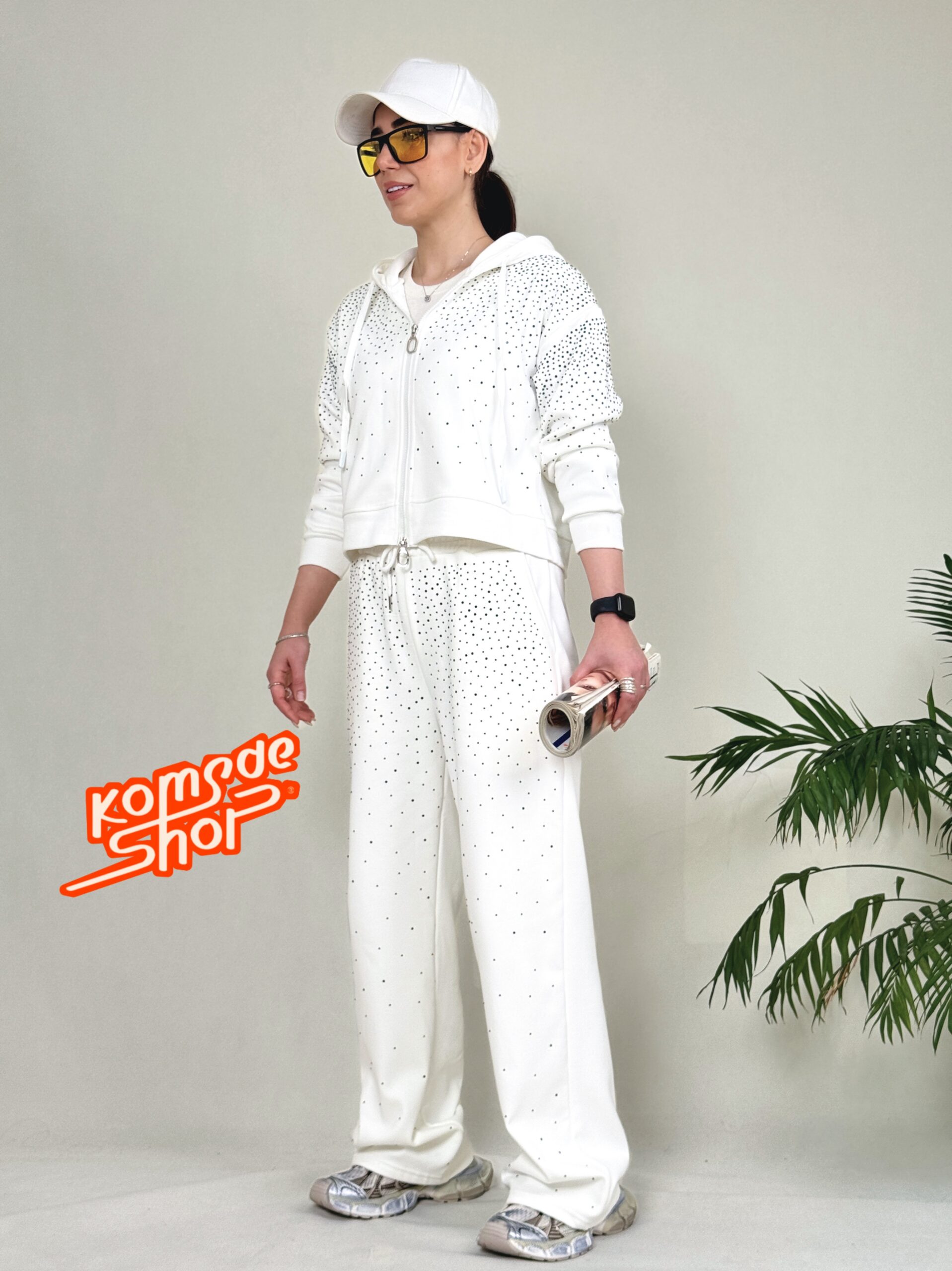 ست سویشرت و شلوار کلاه دار نگینی وارداتی با پارچه دورس سهنخ ۱۰۰٪ پنبه، داخل مخملی و نگینکاری ظریف. فریسایز، نرم، ضخیم و بسیار شیک برای استایل زمستونی لاکچری.