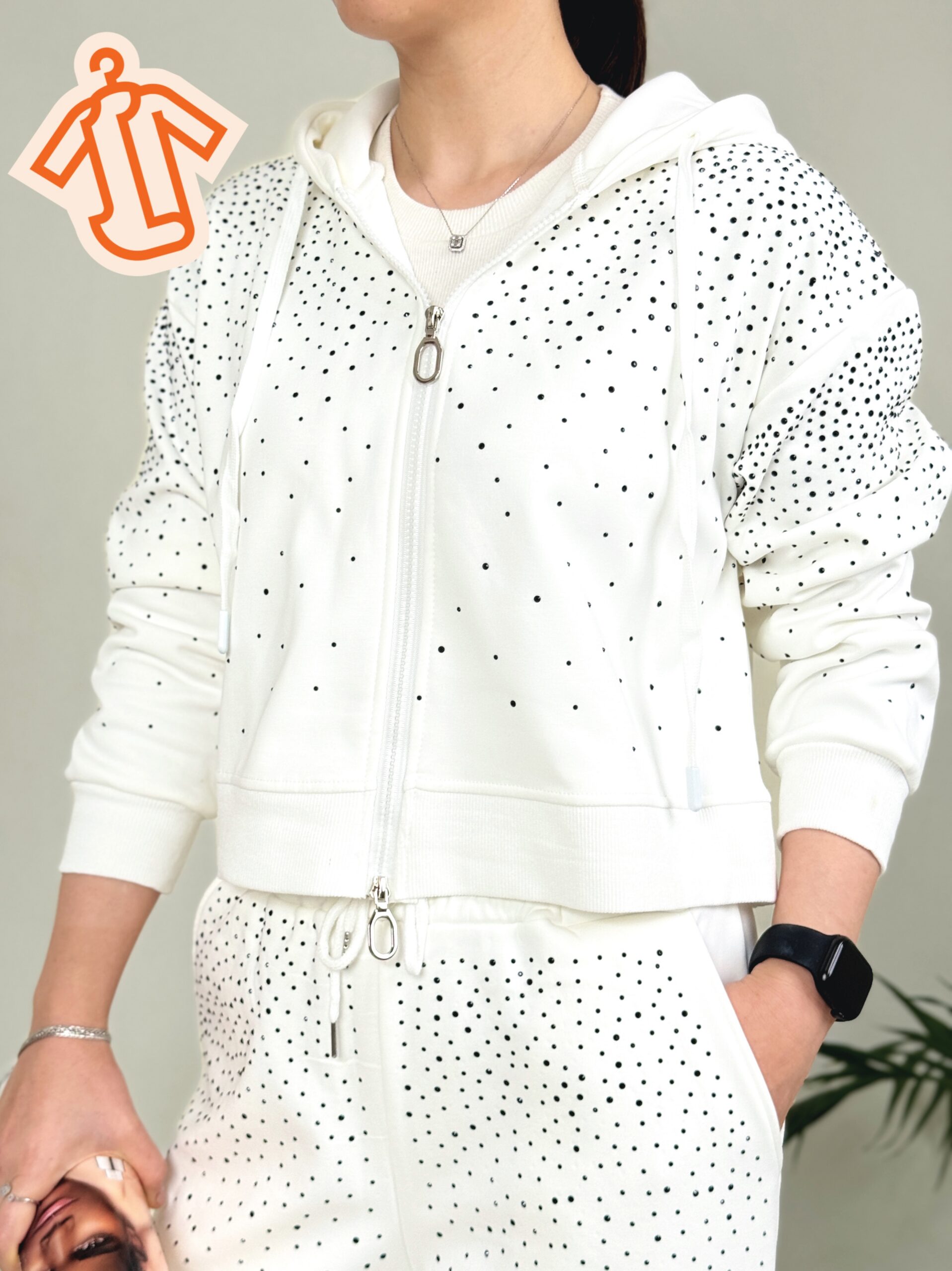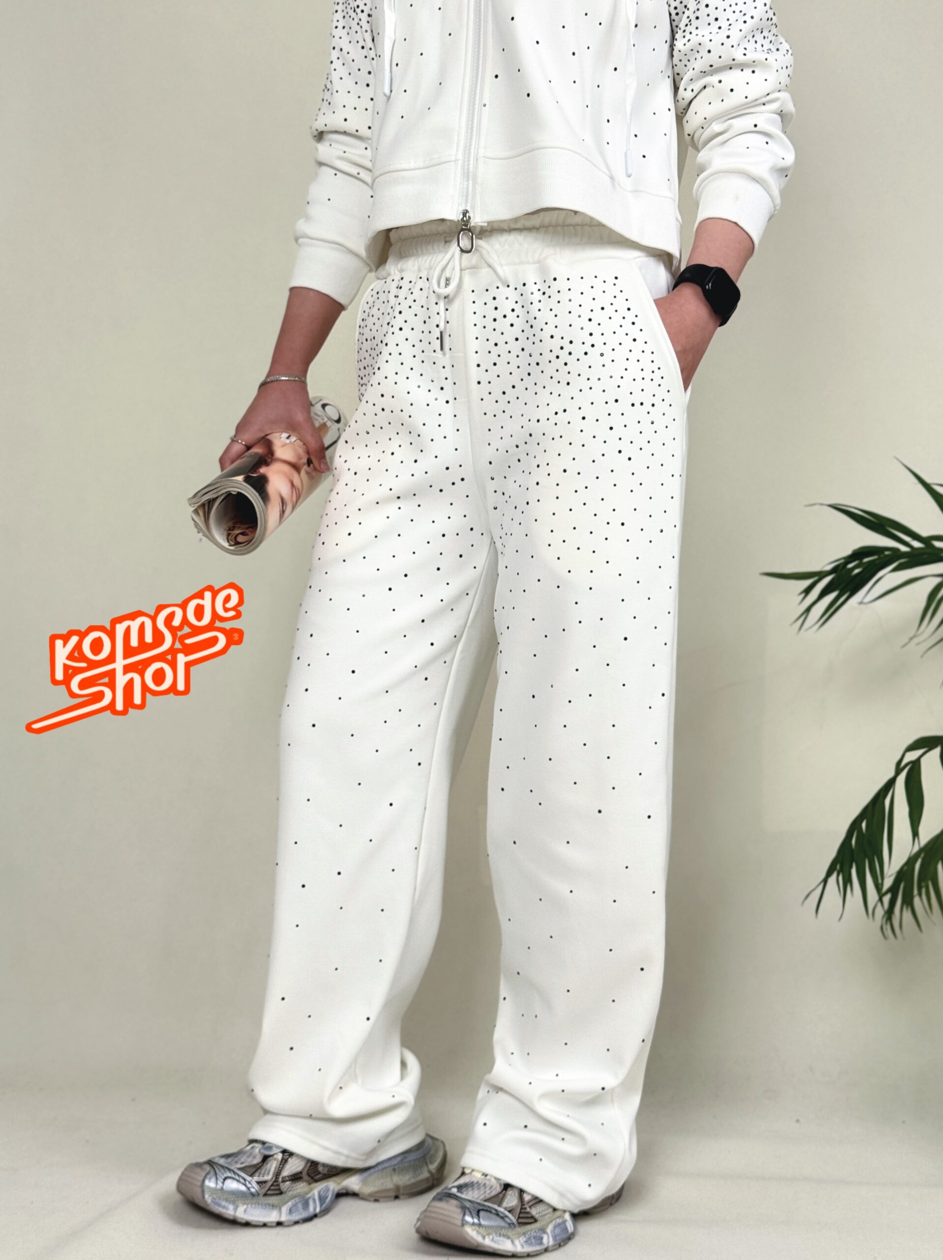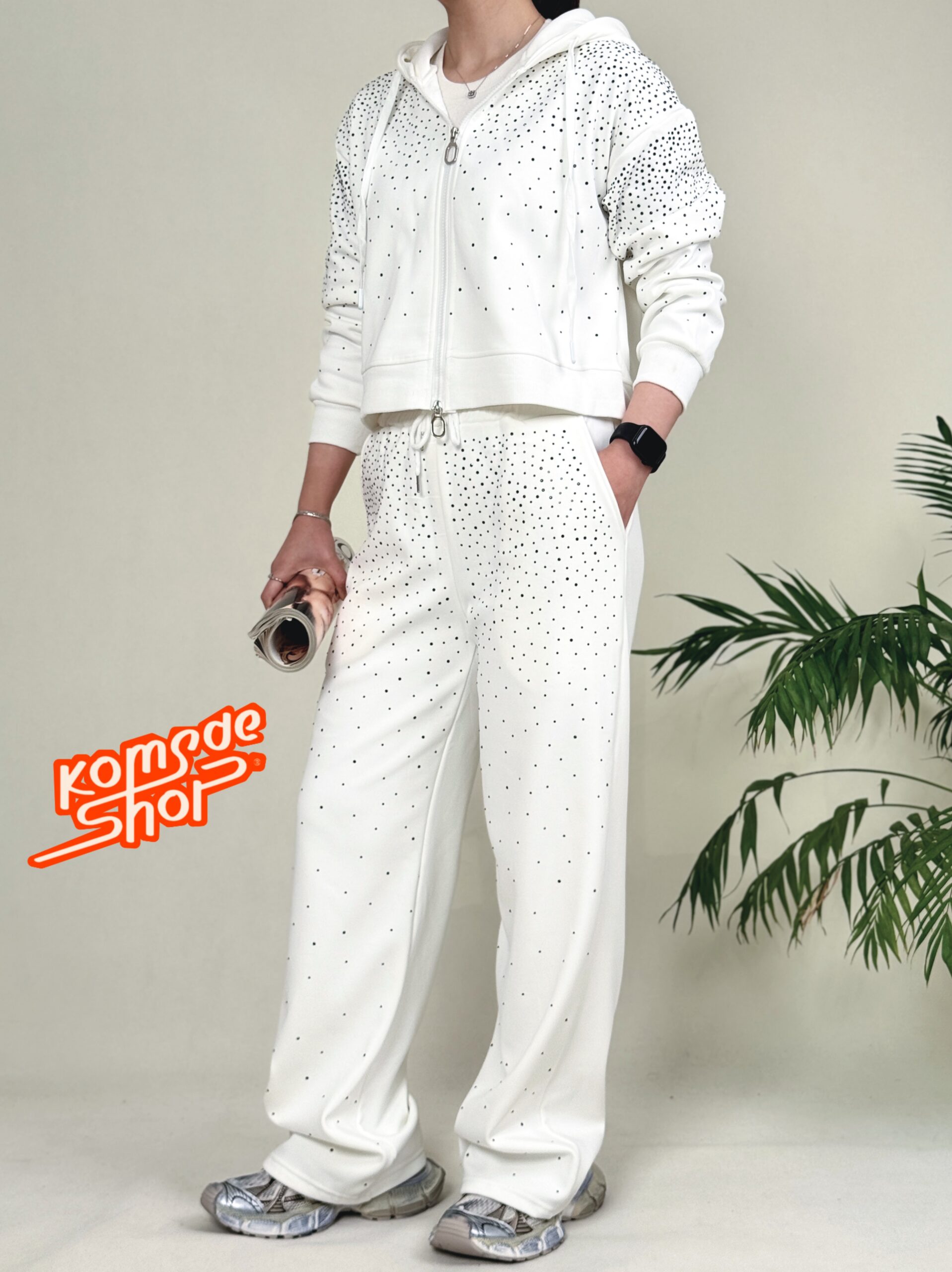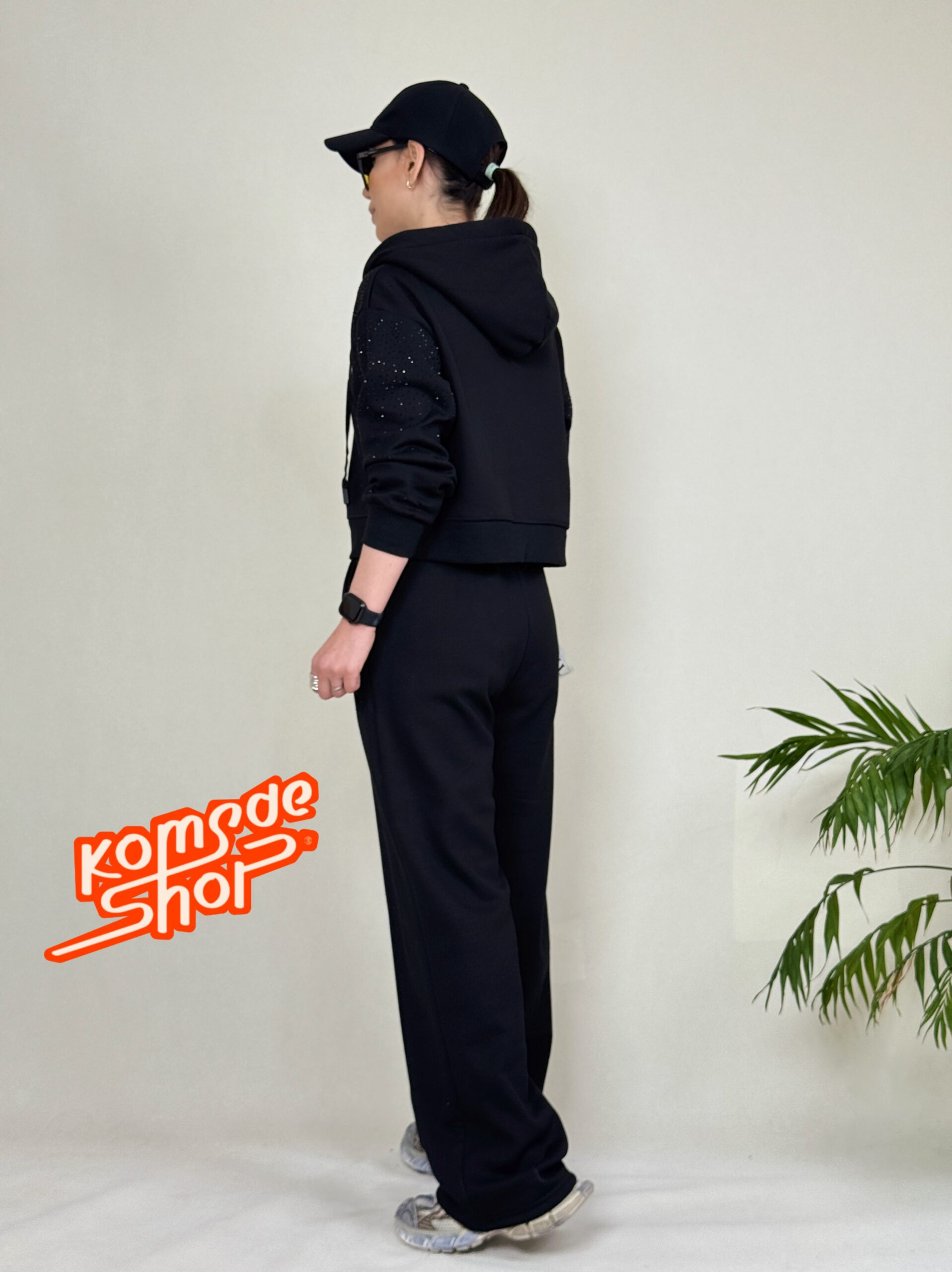 ست سویشرت و شلوار کلاه دار نگینی وارداتی با پارچه دورس سهنخ ۱۰۰٪ پنبه، داخل مخملی و نگینکاری ظریف. فریسایز، نرم، ضخیم و بسیار شیک برای استایل زمستونی لاکچری.