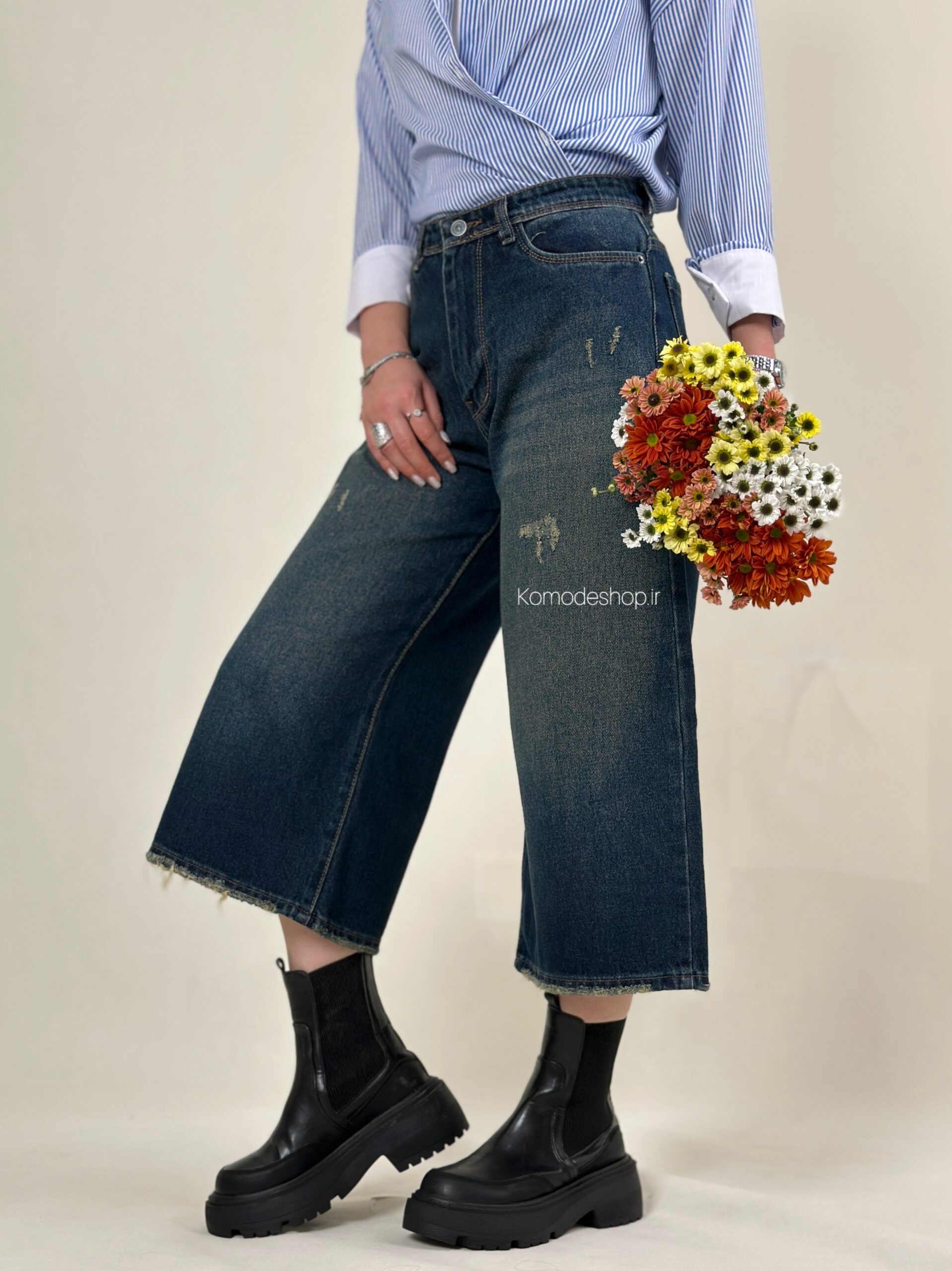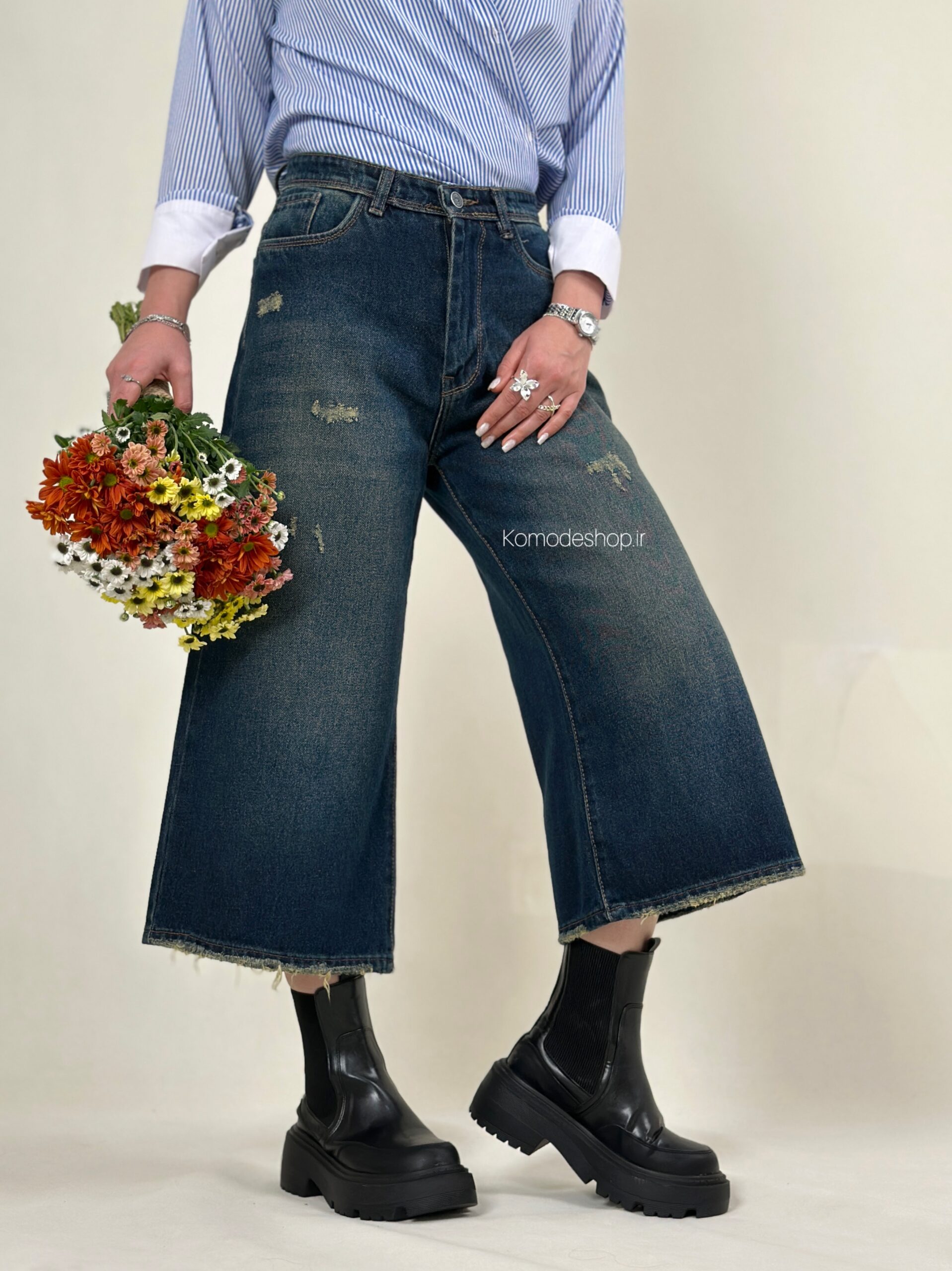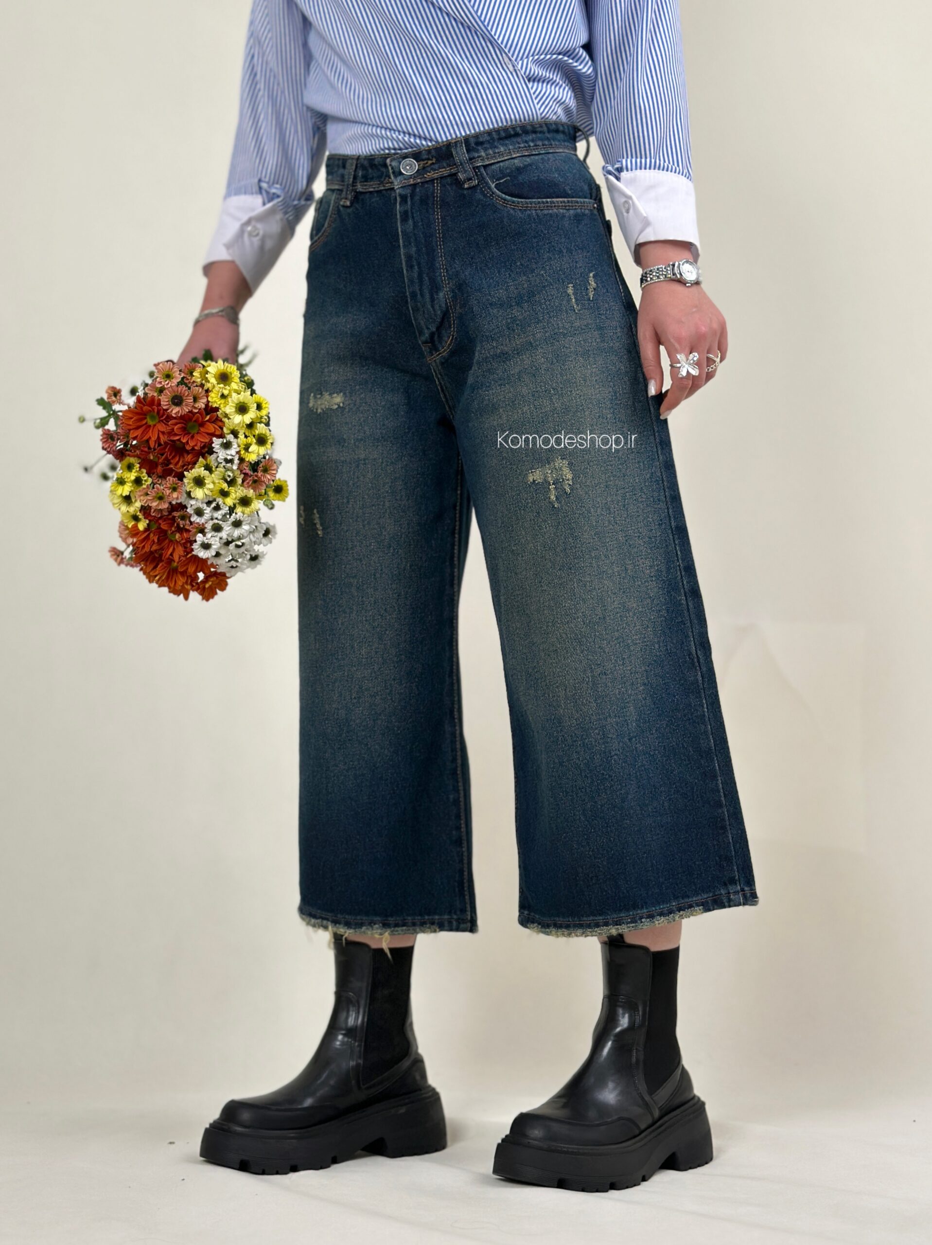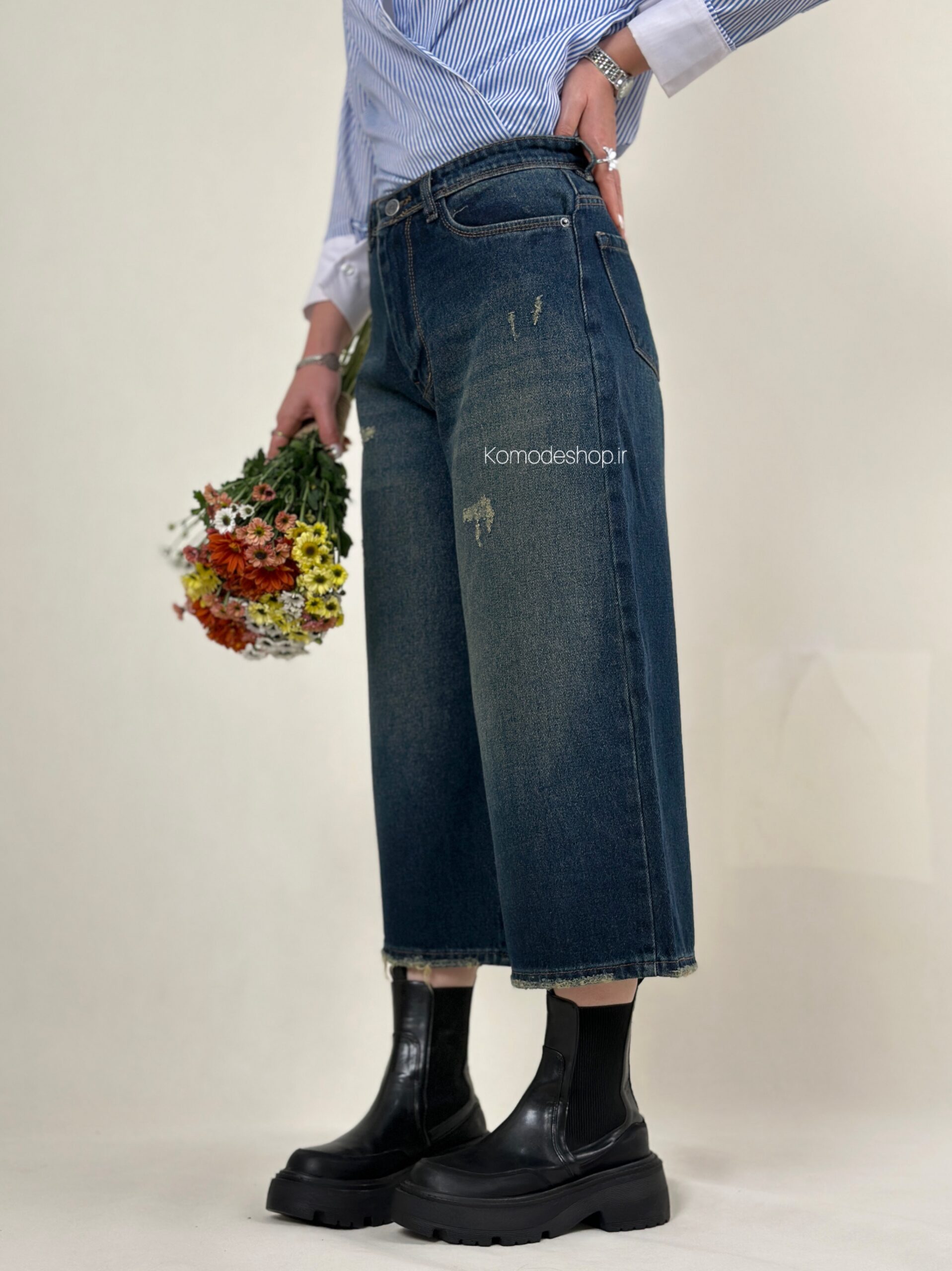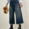 شلوار ایزی سرمه‌ای کثیف🌸 جین کجراه ترک، بدون کش، پشت کمر ساده. قد ۸۴ سانت. کیفیت عالی و تضمینی.