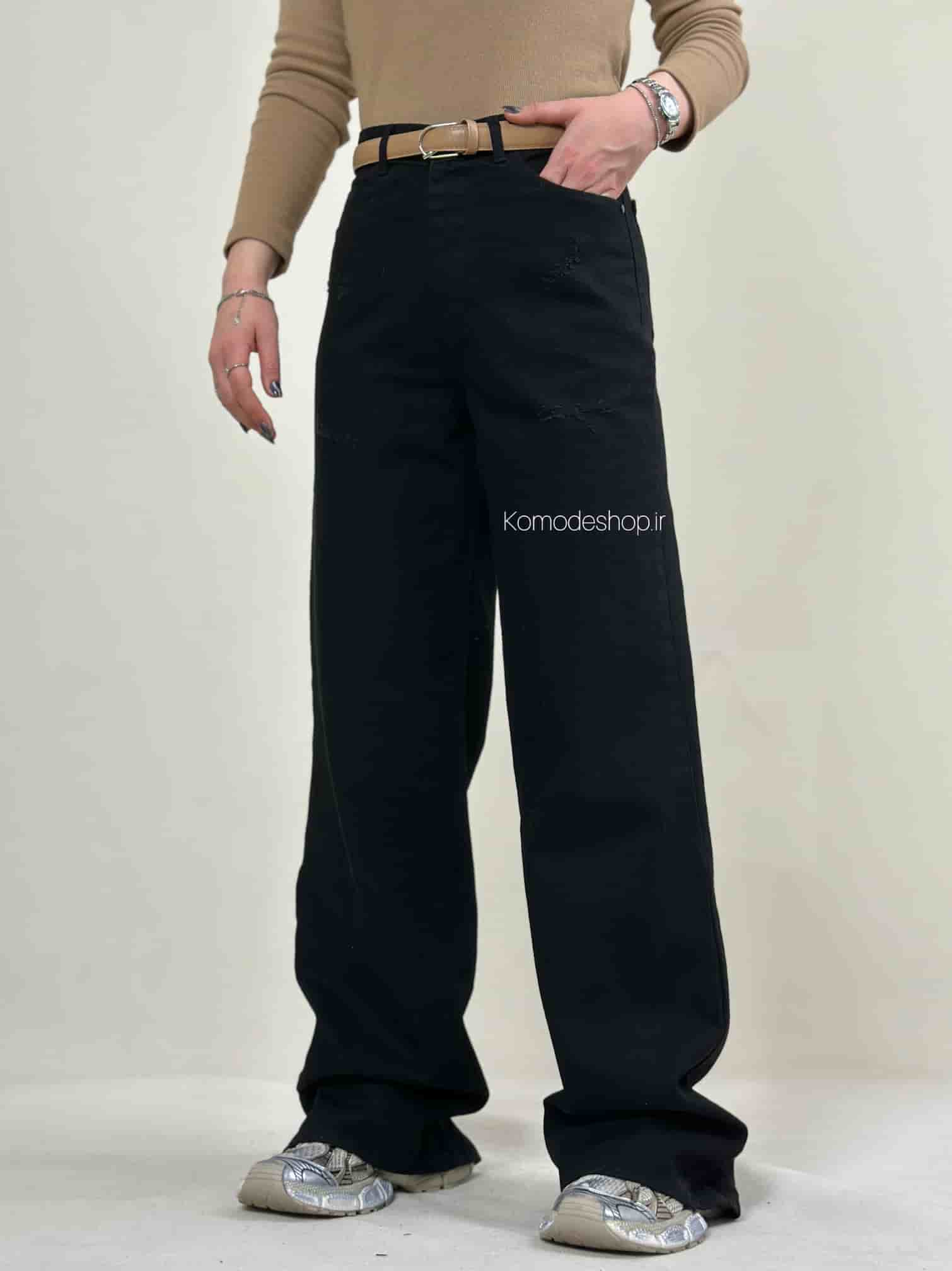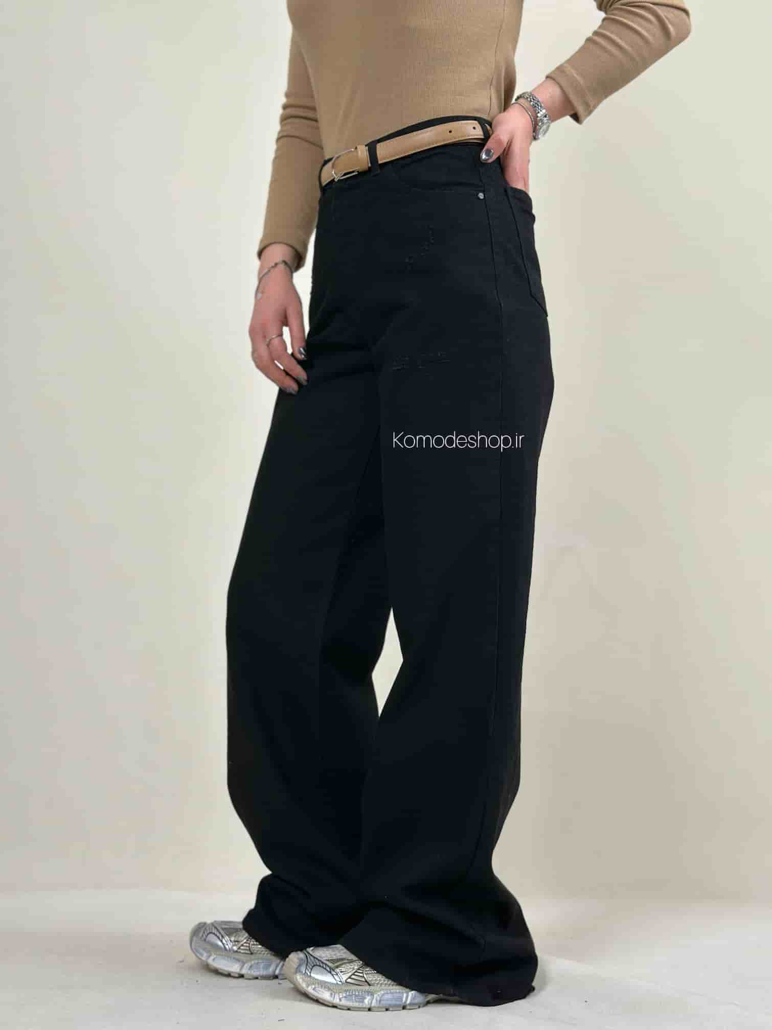 شلوار بگی زنانه یا فلربگ مشکی با پارچه جین بدون کش. قد ۱۱۰ سانت، کیفیت عالی و تضمینی.