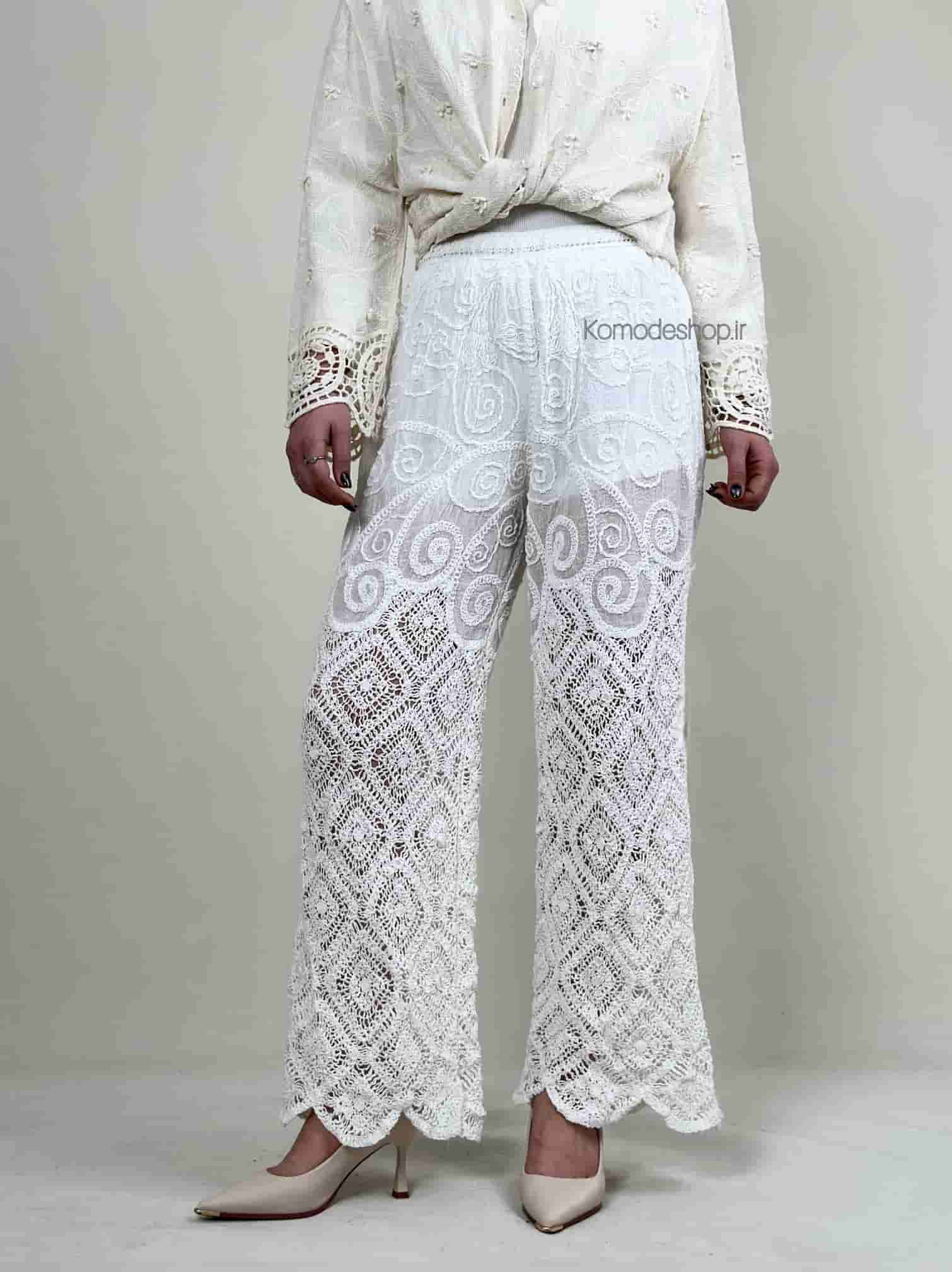 شلوار بوتکات مکرومه بافی وارداتی بسیار لطیف و نرم، ضد حساسیت و فریسایز مناسب 36 تا 42 با کمر کشی. خوشفرم و شیک برای استایلهای خاص در رنگ سفید کا با شومیزهای دانتل و خامه دوزی میتونید استایل کنید.