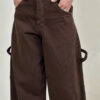 شلوار کارپنتر قهوه‌ای با پارچه کتان گرم بالا، دمپا گتر‌دار و بند تنظیم‌کننده سایز در کمر. مناسب پاییز و زمستان، خوش‌فرم، مقاوم و بسیار کاربردی.
