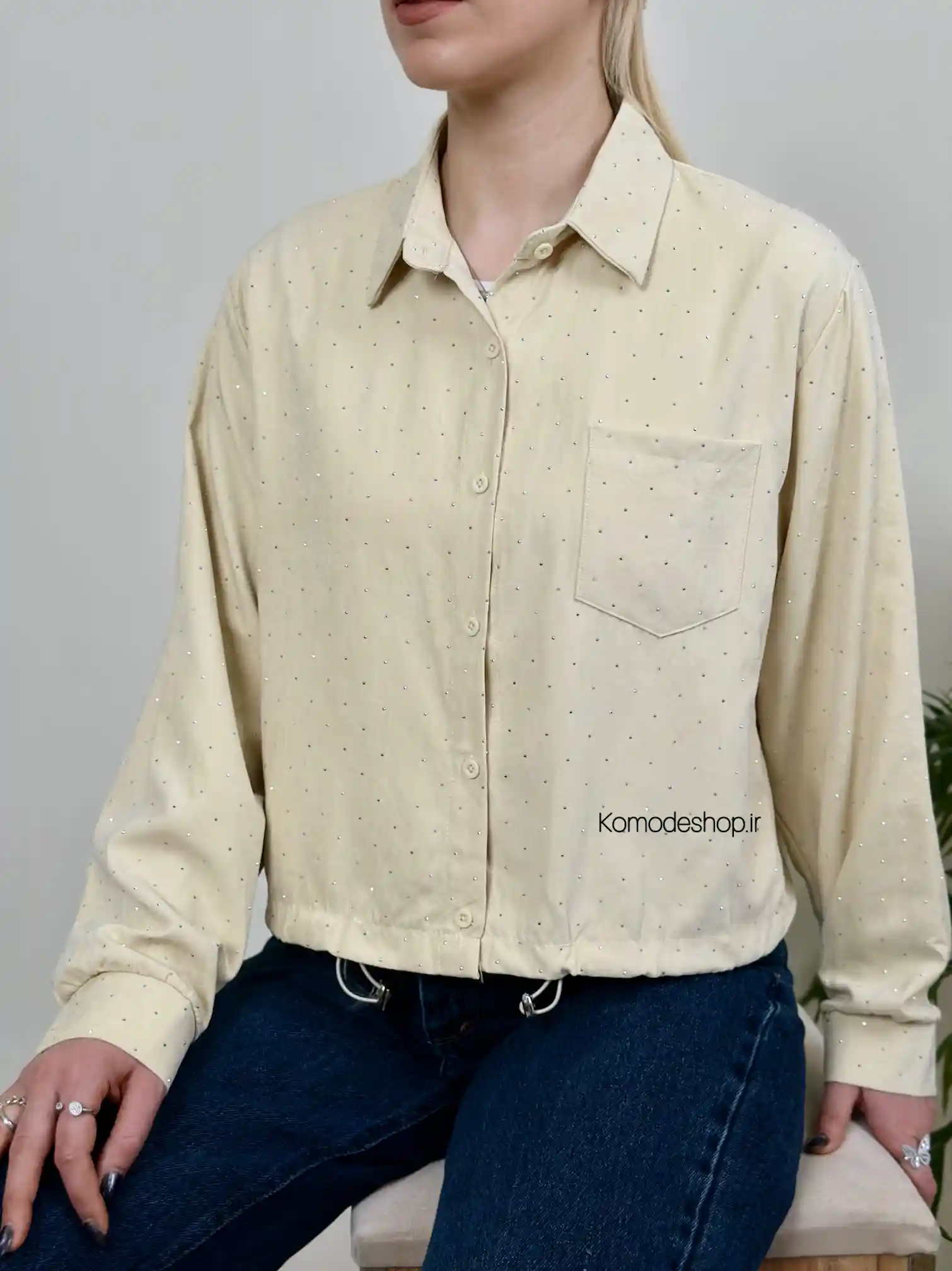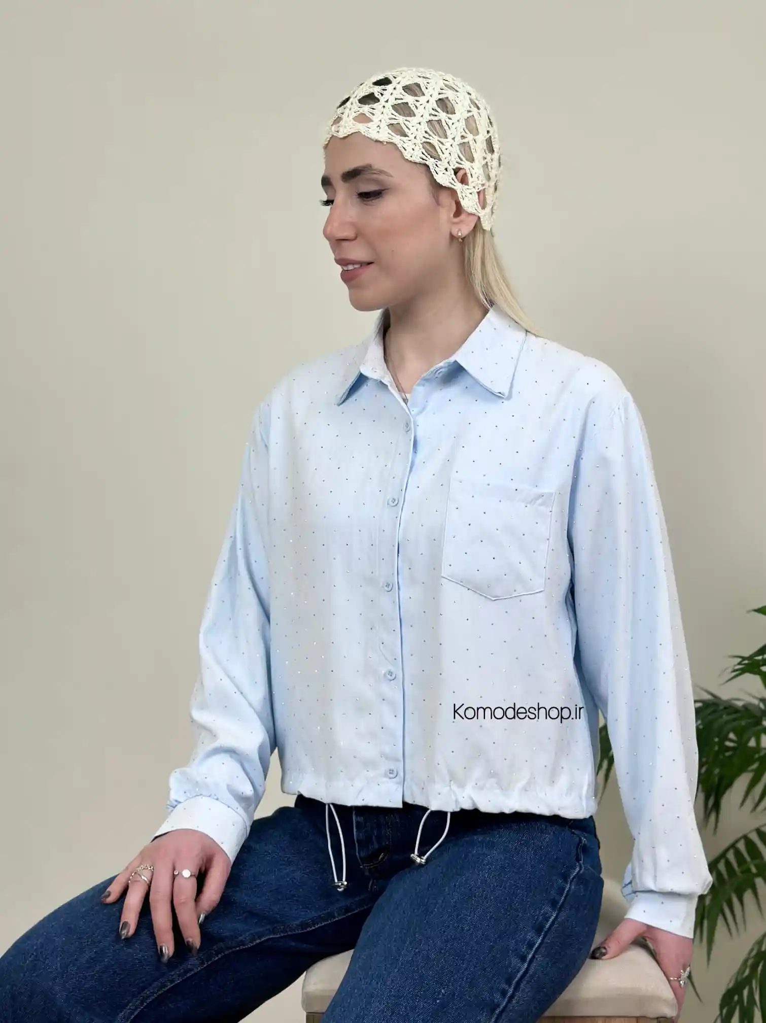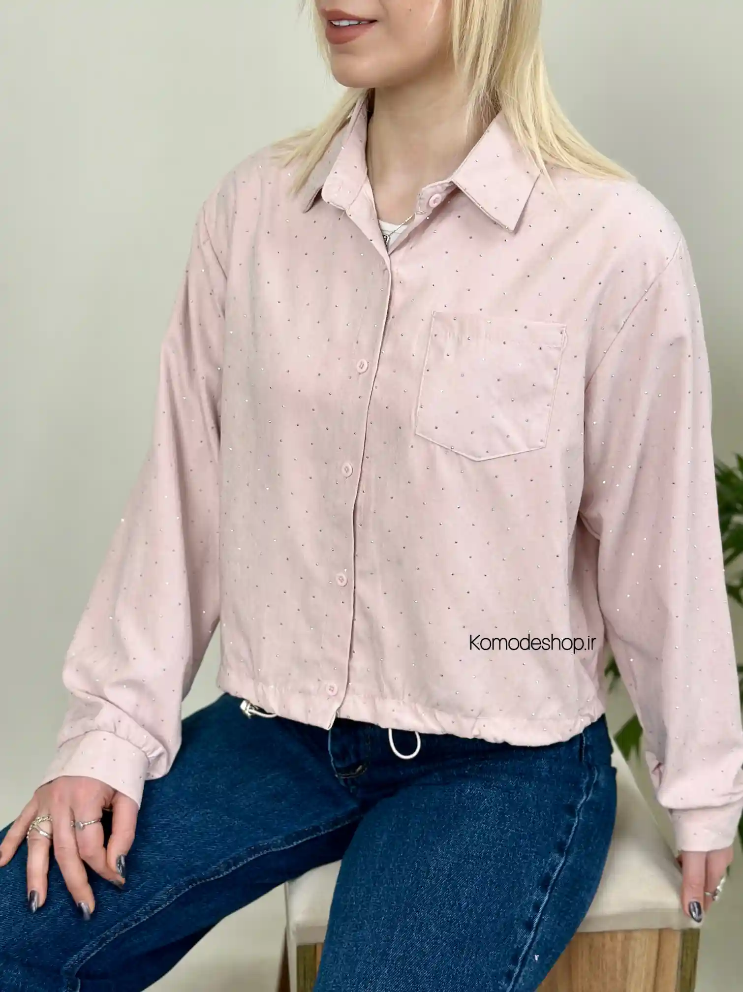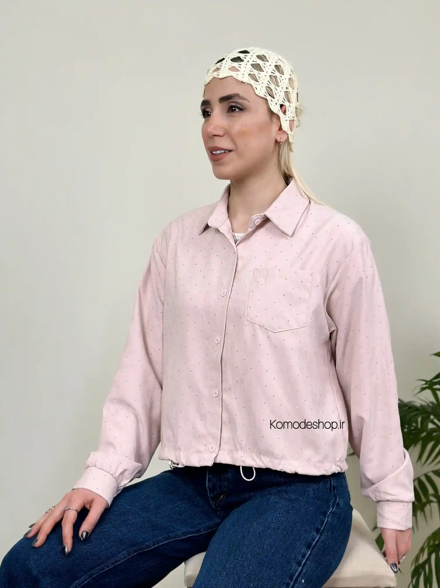 آنچه این شومیز کراپ دخترانه را از مدلهای ساده بازار متمایز میکند، نگینکاری ظریف روی آن است. این نگینها جلوهای درخشان و جذاب به لباس میدهند بدون اینکه ظاهر آن را شلوغ یا اغراقآمیز کنند. همین تعادل بین سادگی و درخشش، این مدل را به گزینهای مناسب برای استایلهای دخترانه و فانتزی تبدیل کرده است.