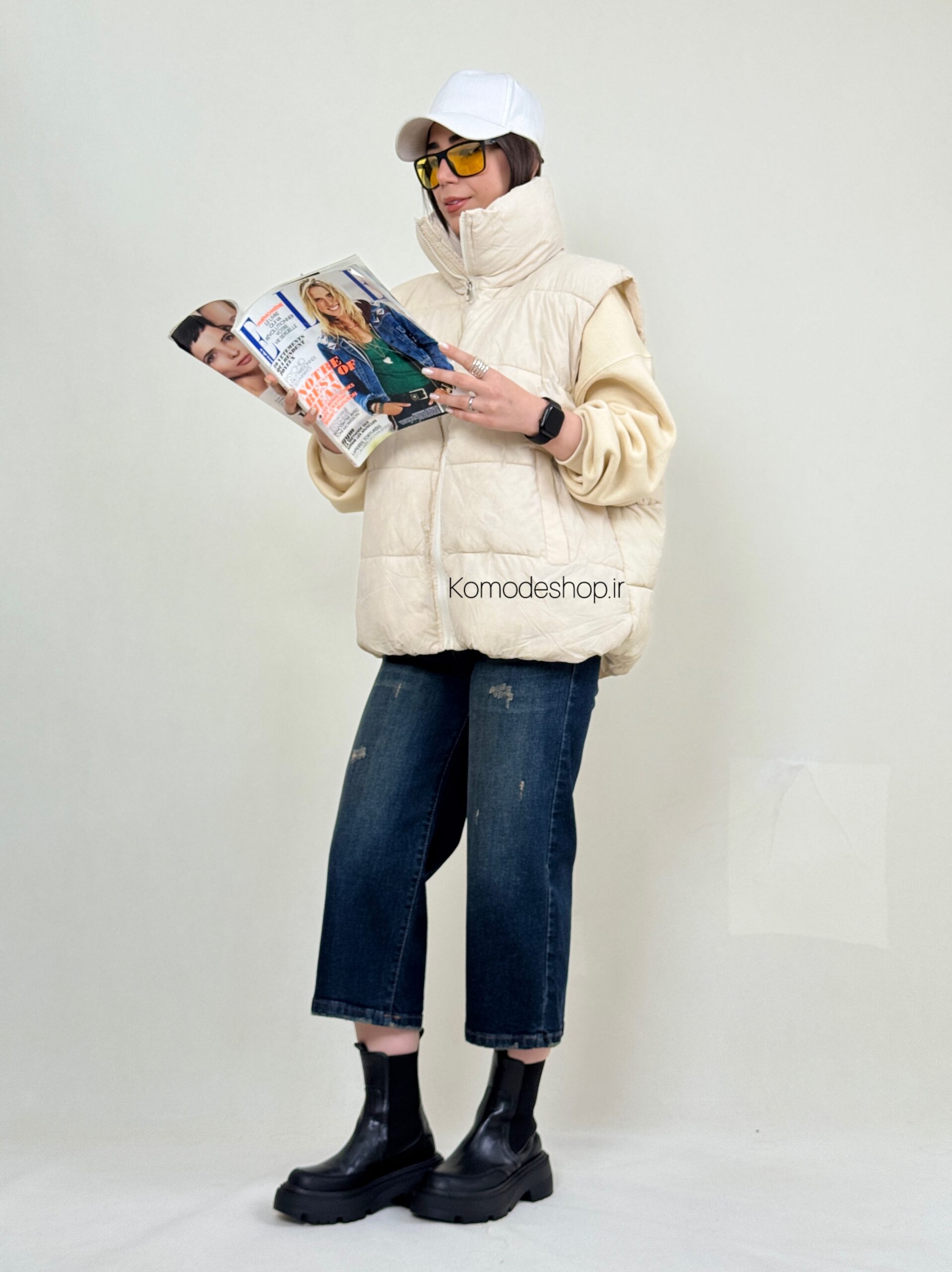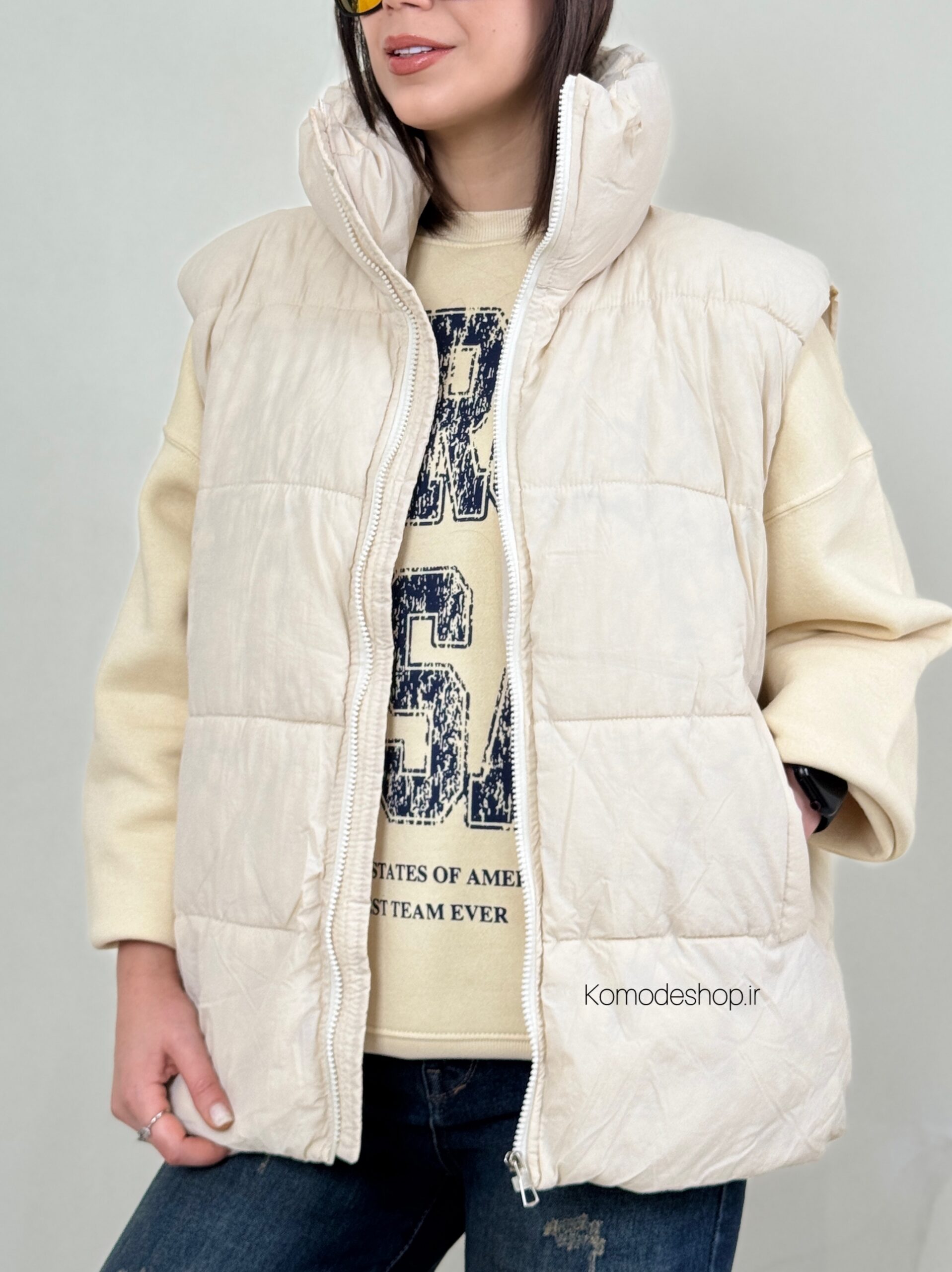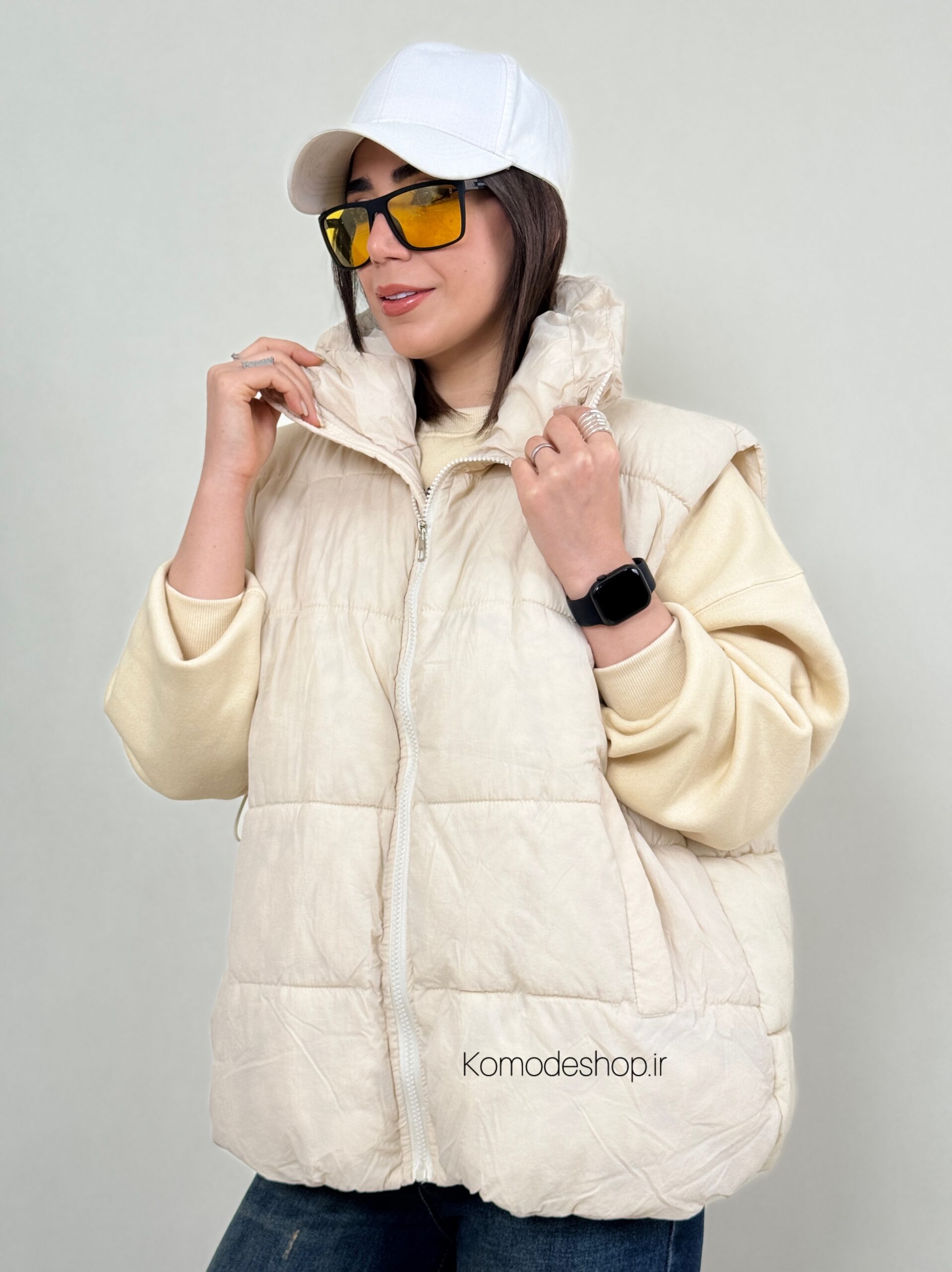 وست پافر وارداتی Chic با طراحی خاص، پارچه سبک و نرم، فریسایز و رنگ سفید. دارای گتر در تمام قسمتها برای ایجاد استایل پفیتر. مناسب پاییز و زمستان.