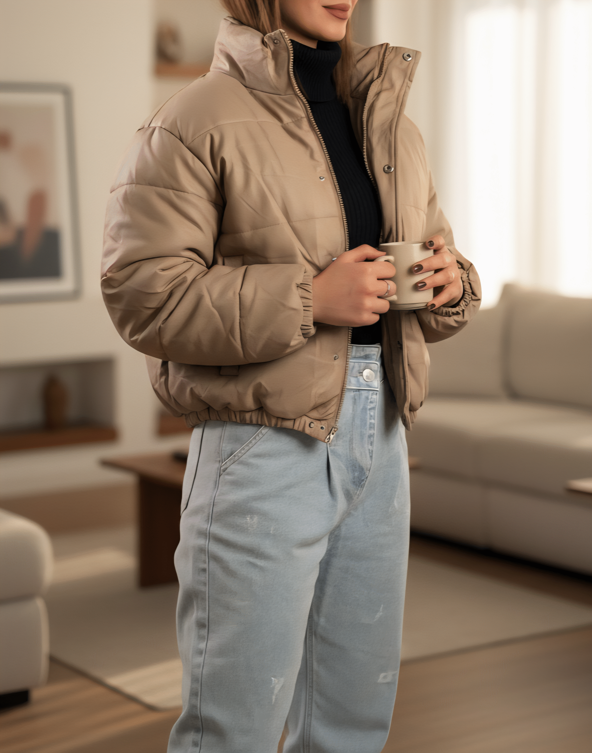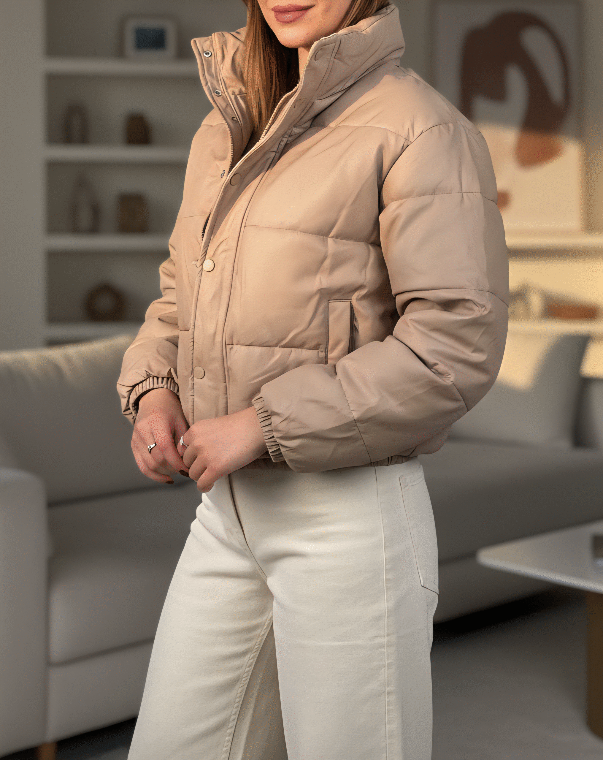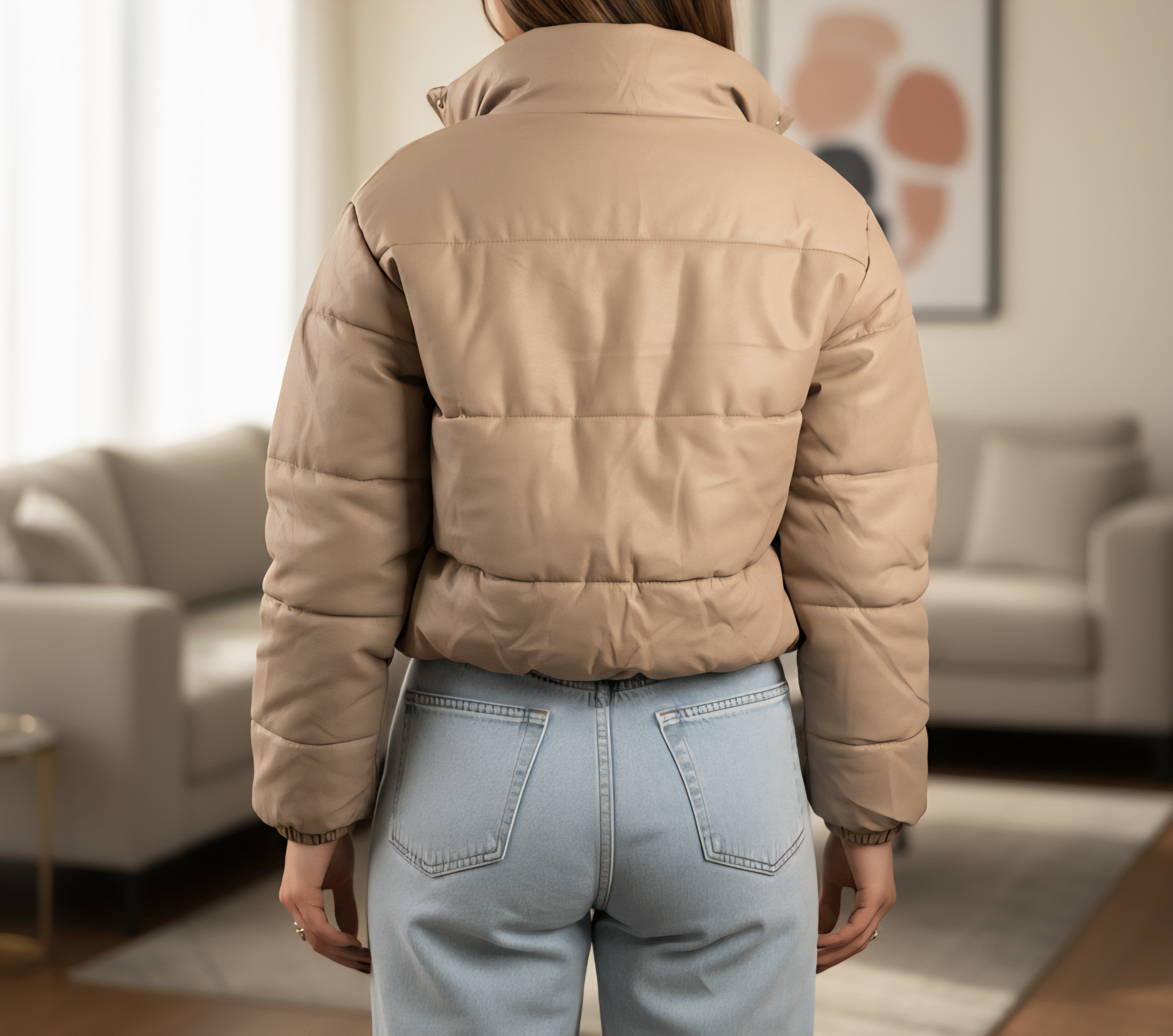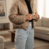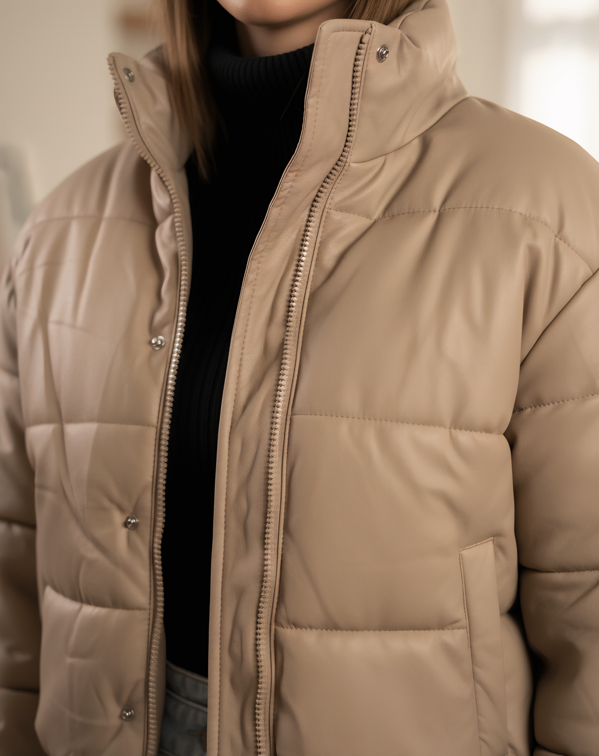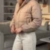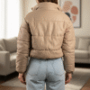 کاپشن کراپ تیوپی زنانه از جنس چرم براق با آستر و پشم‌شیشه گرم بالا، فری‌سایز و سبک. طراحی کوتاه و خاص، مناسب استایل‌های خیابانی و ترند زمستونی.