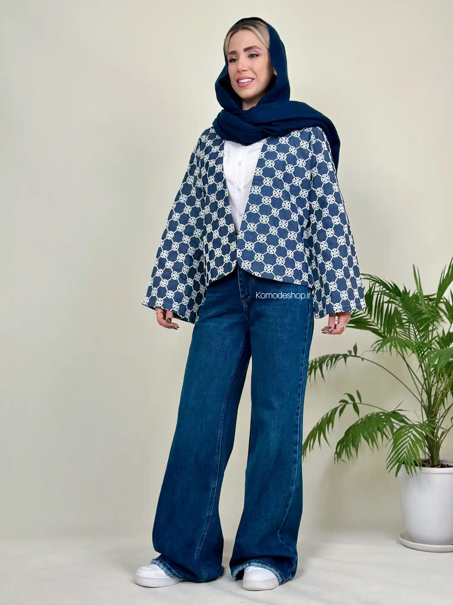 کت جین گلدوزی + تیشرت ساده سفید + شلوار بگ + کتانی